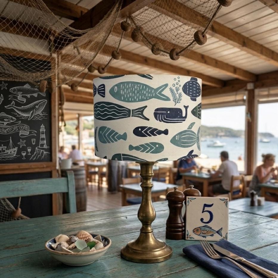 Illuminate your space with elegance using the LAMPARiOMA handcrafted luxury lampshade featuring a captivating blue fish motif. Bring the calming charm of underwater beauty into your home with this unique and stunning piece. Elevate your decor and enjoy the tranquil presence of blue fishes every day.