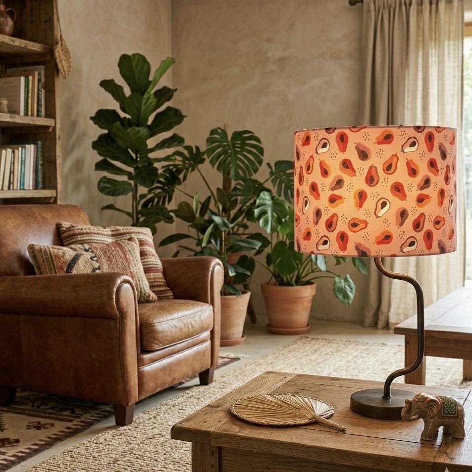 Bring a touch of tropical charm into your home with LAMPARiOMA's handcrafted luxury lampshade featuring pink papayas. Elevate your space with this beautiful statement piece and bask in the delightful allure of papaya every day. This lampshade is sure to create a warm and inviting ambiance in any room. This lampshade is perfect for home decor and makes a fantastic handmade gift.