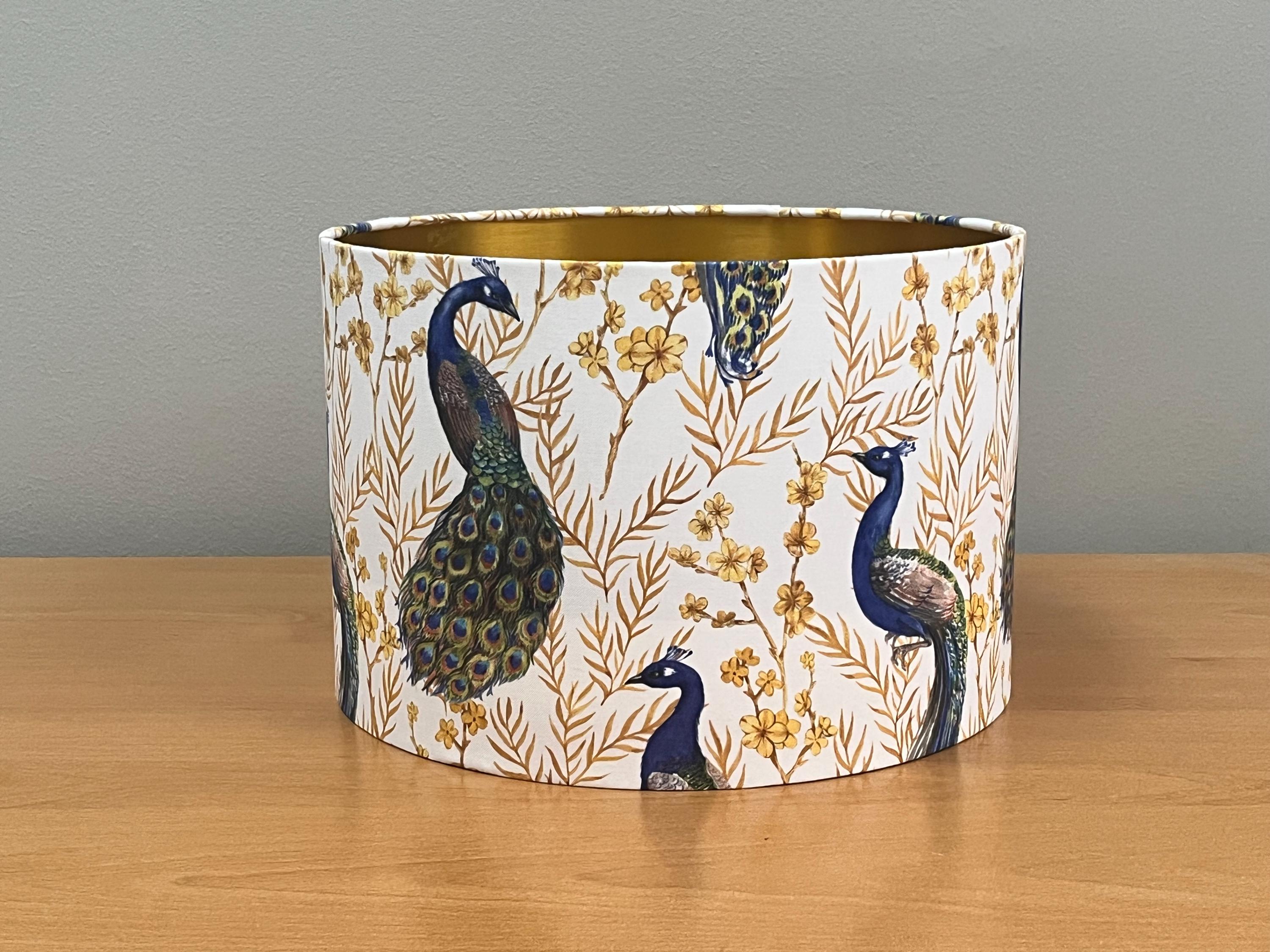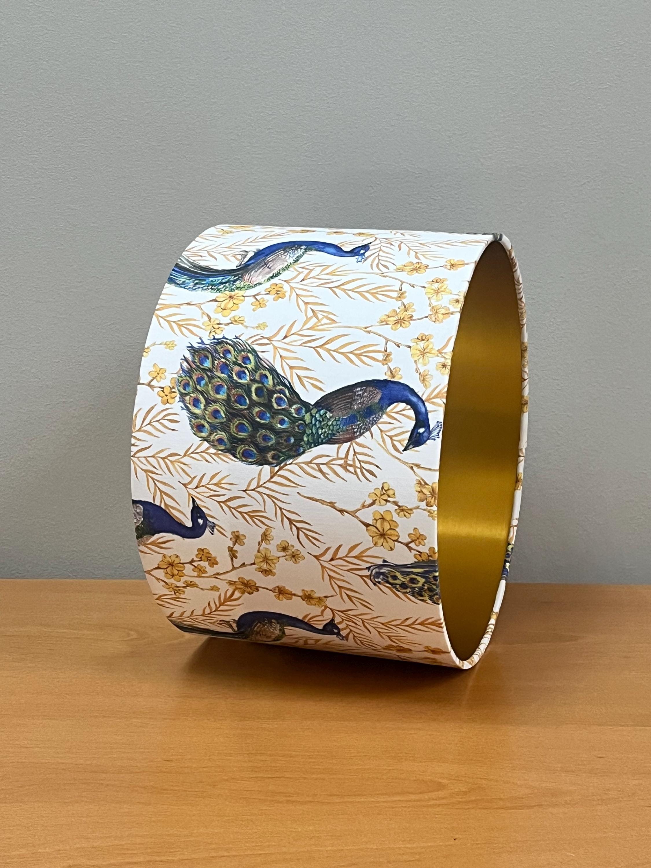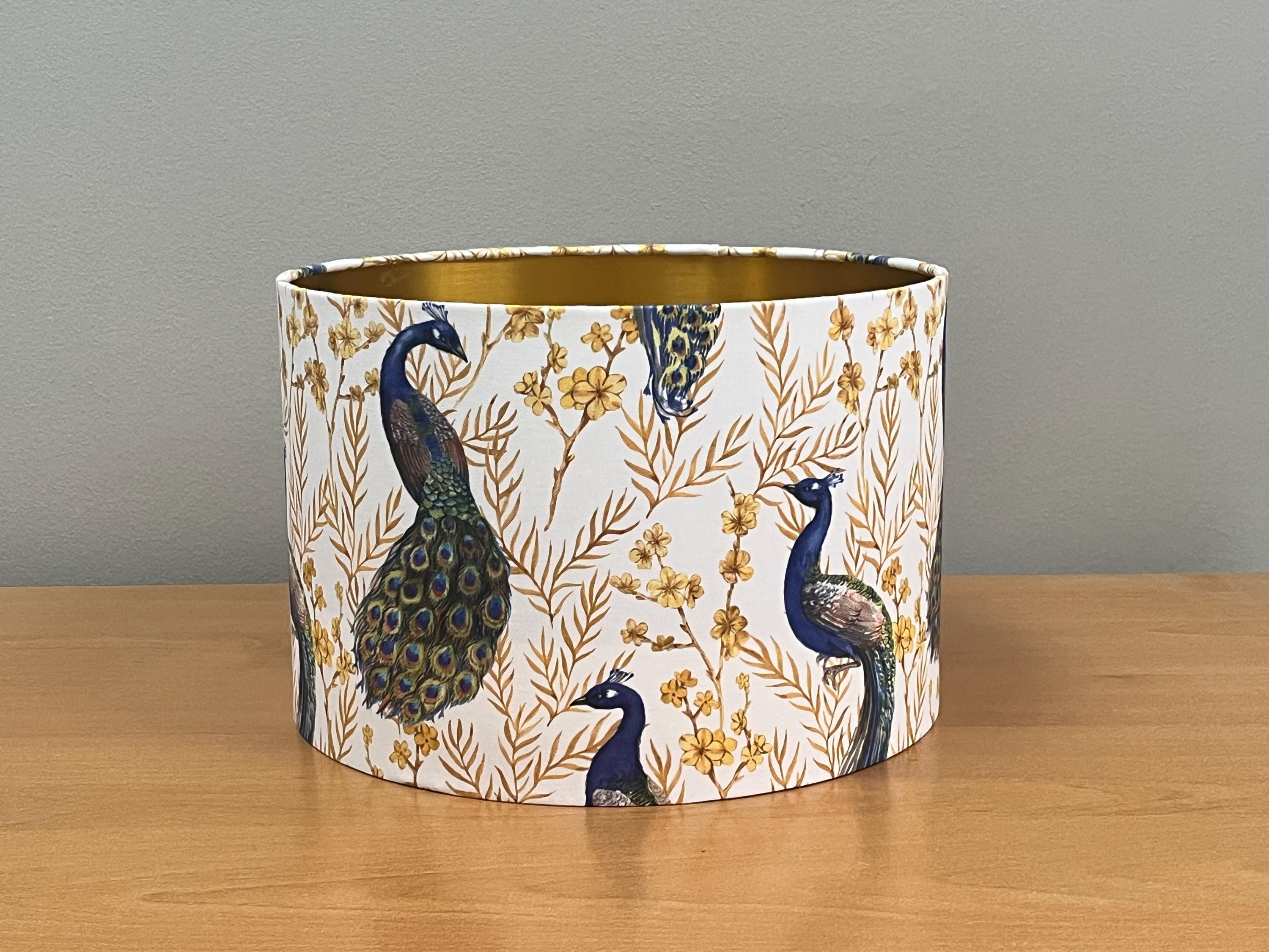 Add a touch of elegance to your space with this stunning lampshade! Adorned with luxurious gold-colored plants and a majestic peacock on a crisp white background, this piece will instantly elevate your home decor. Illuminate your room in style with this unique and eye-catching lampshade.