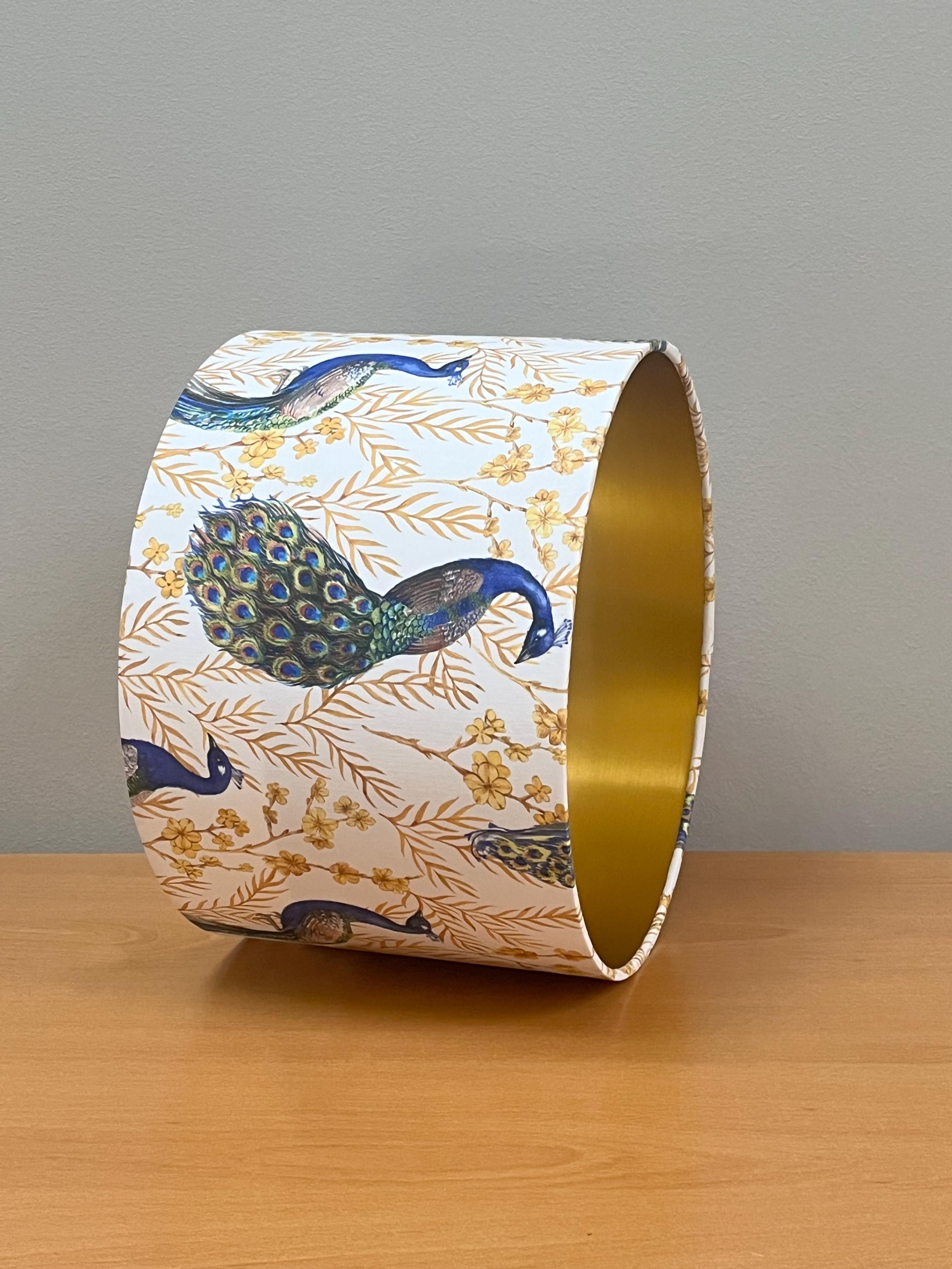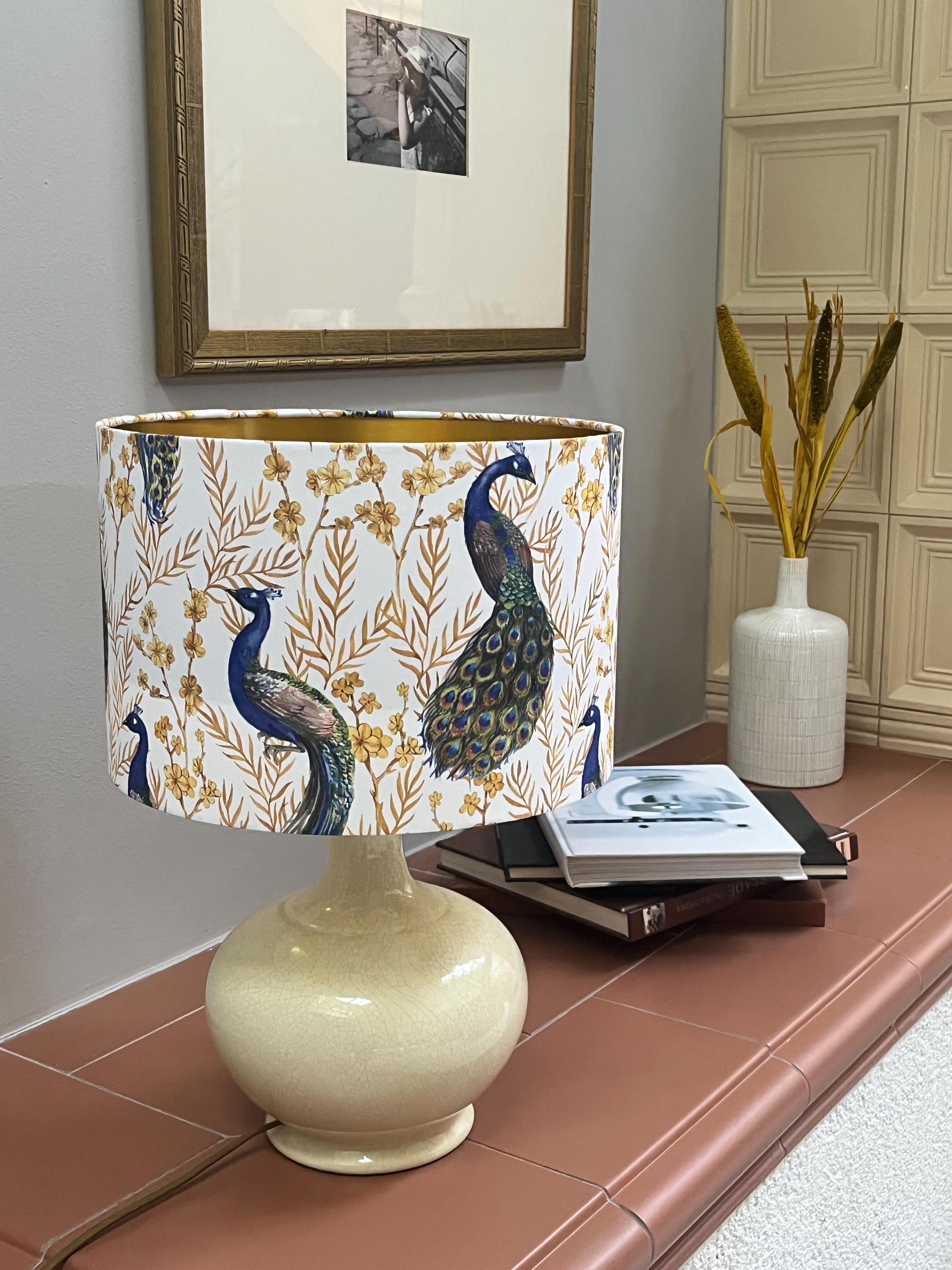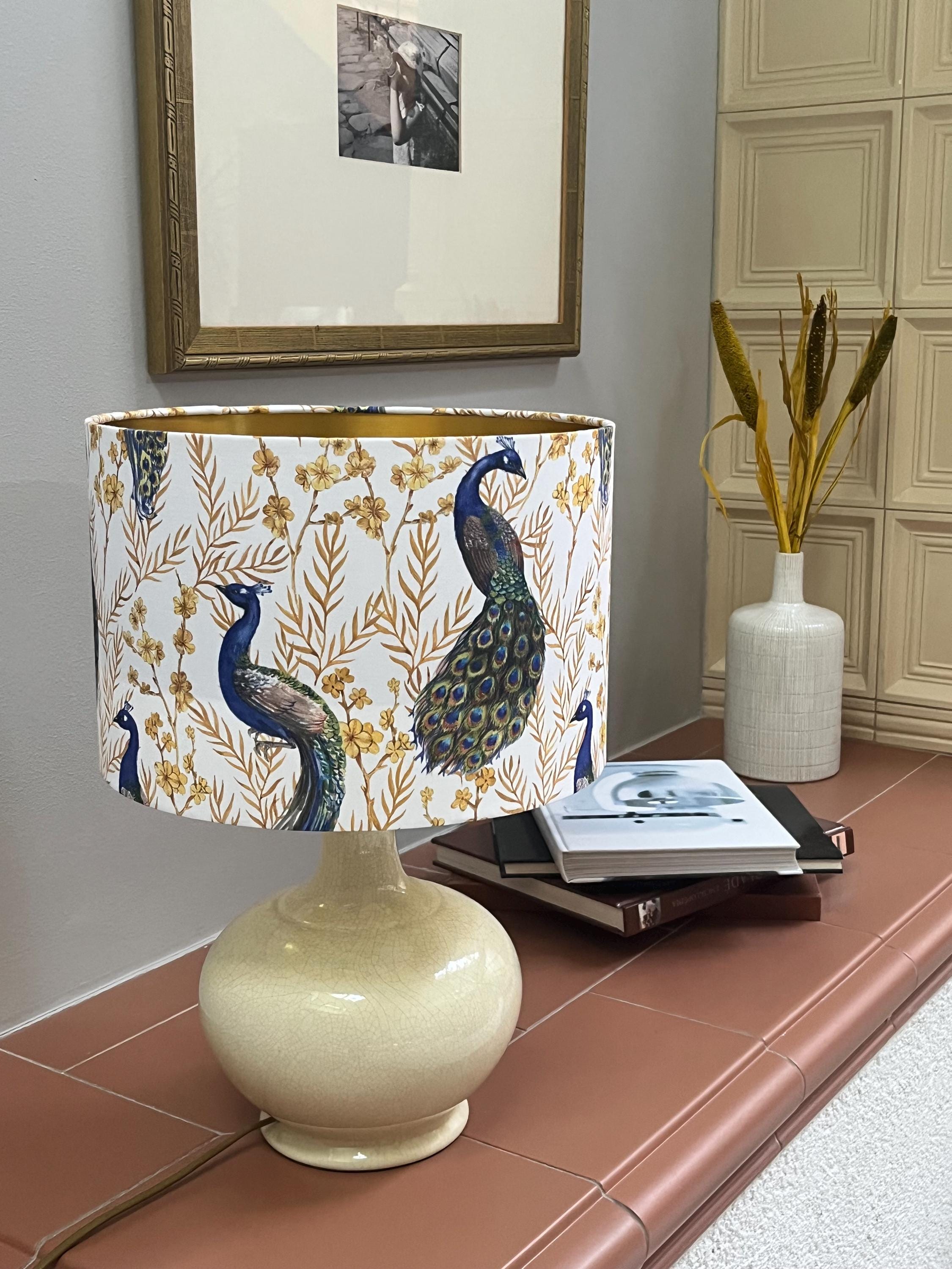 Add a touch of elegance to your space with this stunning lampshade! Adorned with luxurious gold-colored plants and a majestic peacock on a crisp white background, this piece will instantly elevate your home decor. Illuminate your room in style with this unique and eye-catching lampshade.