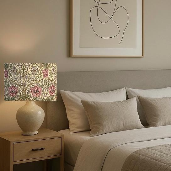 Add a touch of romance to your space with this stunning lampshade featuring a Honeysuckle Rose pattern inspired by the timeless elegance of the William Morris style. Elevate your home decor with this exquisite piece that exudes charm and sophistication. Perfect for creating a cozy ambiance with a touch of vintage allure. If you look closely at the lampshade pattern, you will see a flower enclosed in a heart. How unique, isn't it?