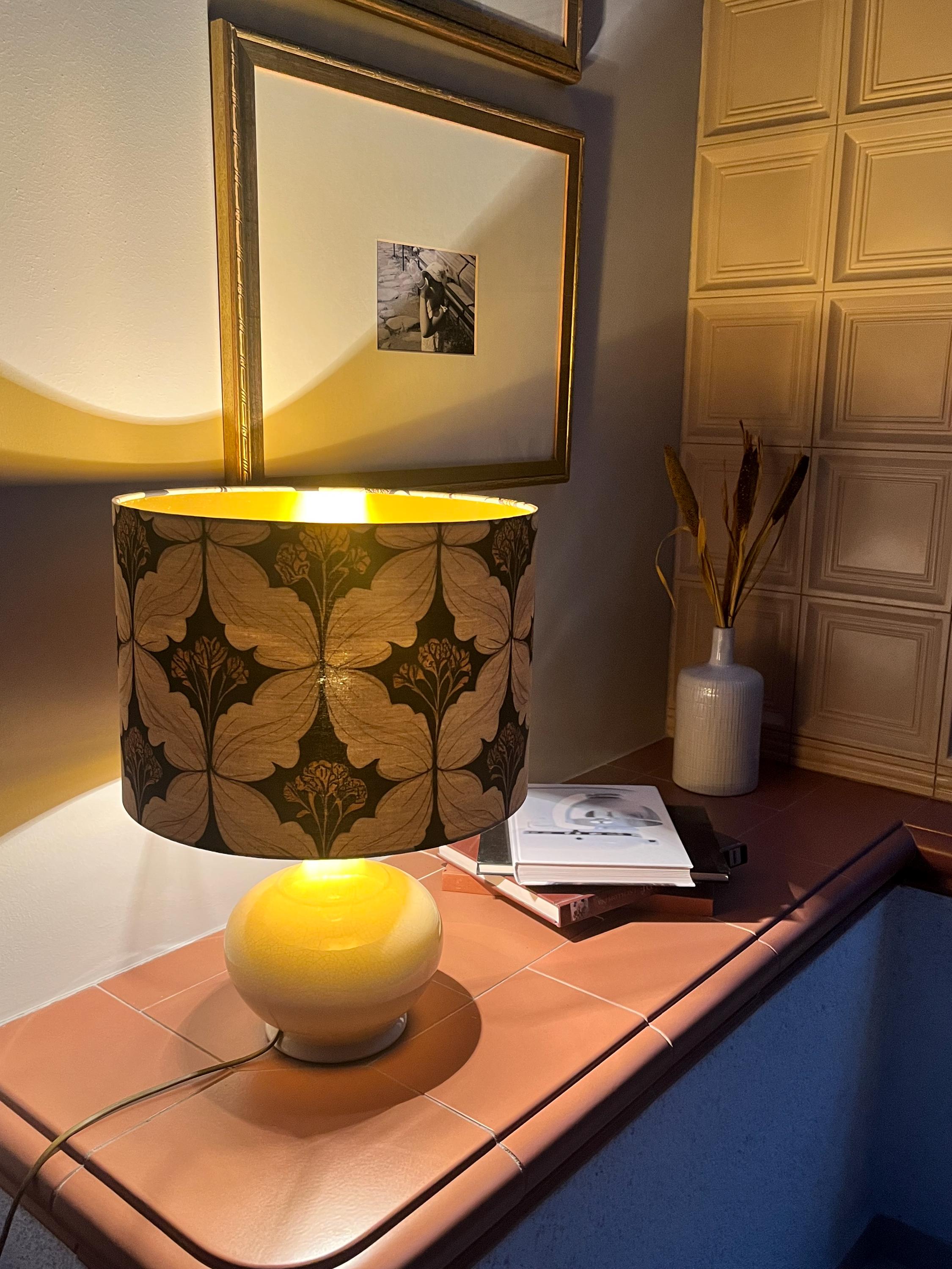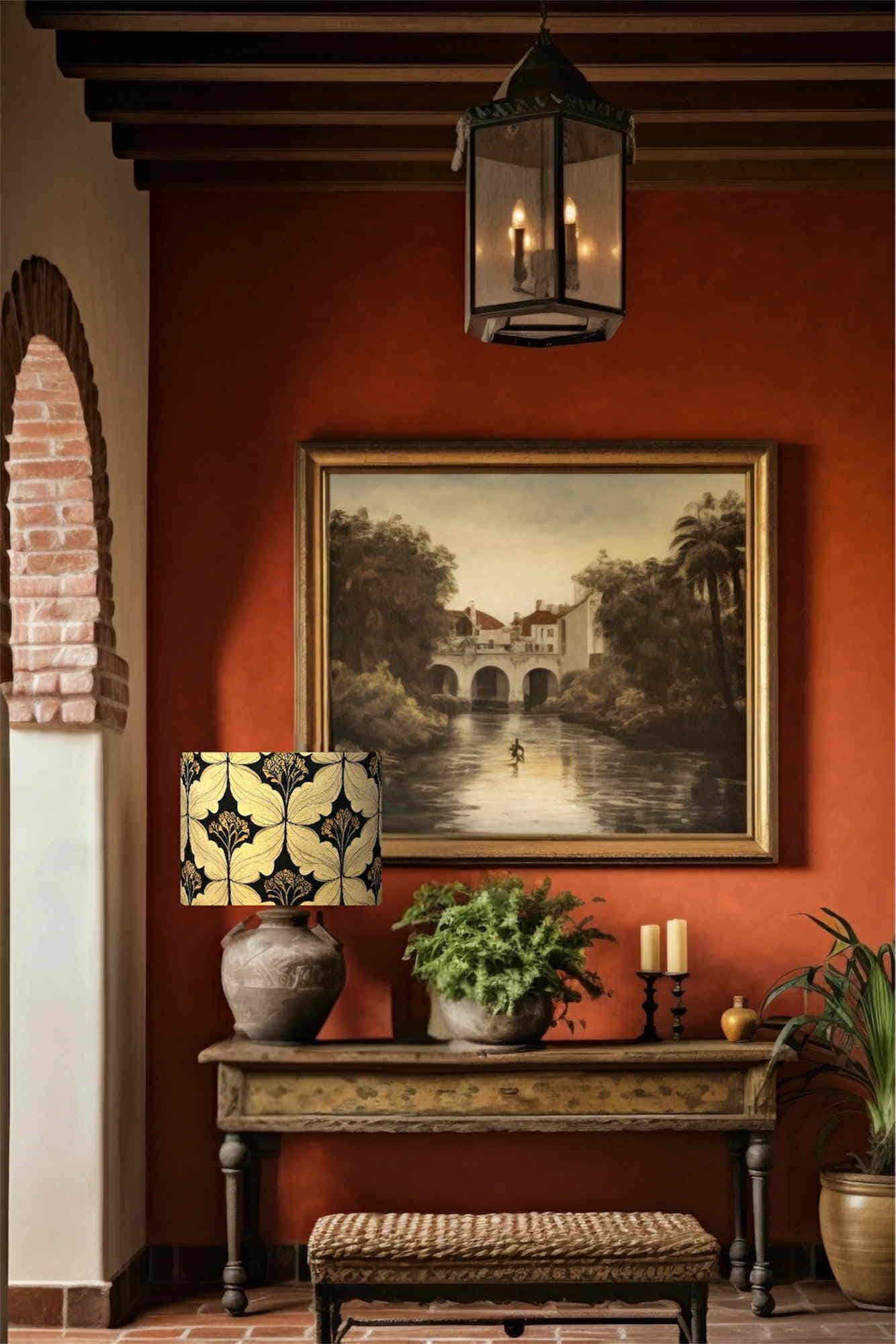 Transform your living space with this exquisite lampshade, beautifully crafted with a classic pattern inspired by William Morris. The elegant combination of black, beige, and gold hues effortlessly adds a touch of sophistication to any room. Illuminate your home with timeless style and charm.