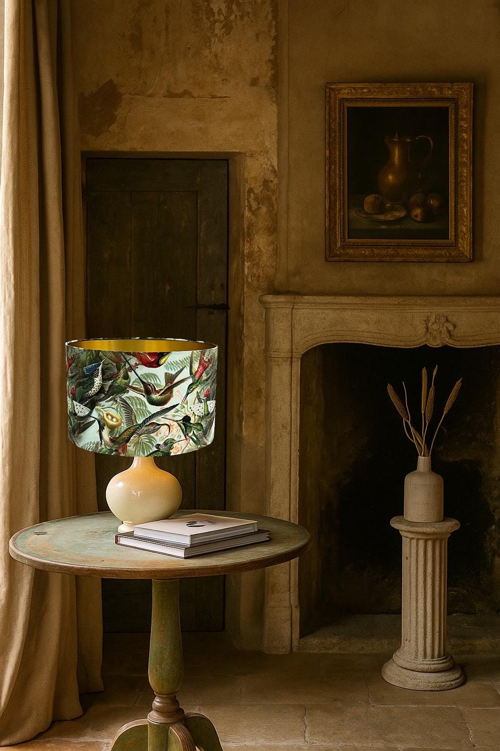 The outer side is decorated with delicate hummingbird patterns, evoking the small wonders of nature, and the inner side has an elegant gold lining, so the light shines in a warmer, richer tone. This contrast makes it truly special: a lampshade that exudes both a vintage feel and a modern, homely elegance.