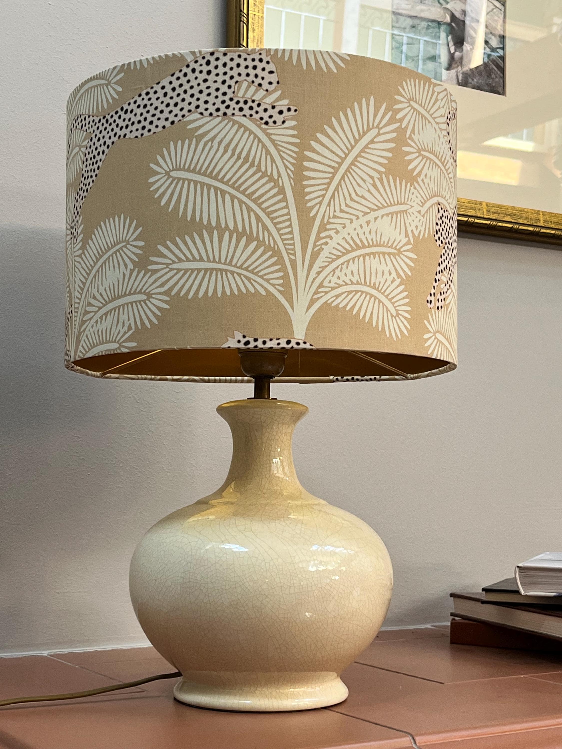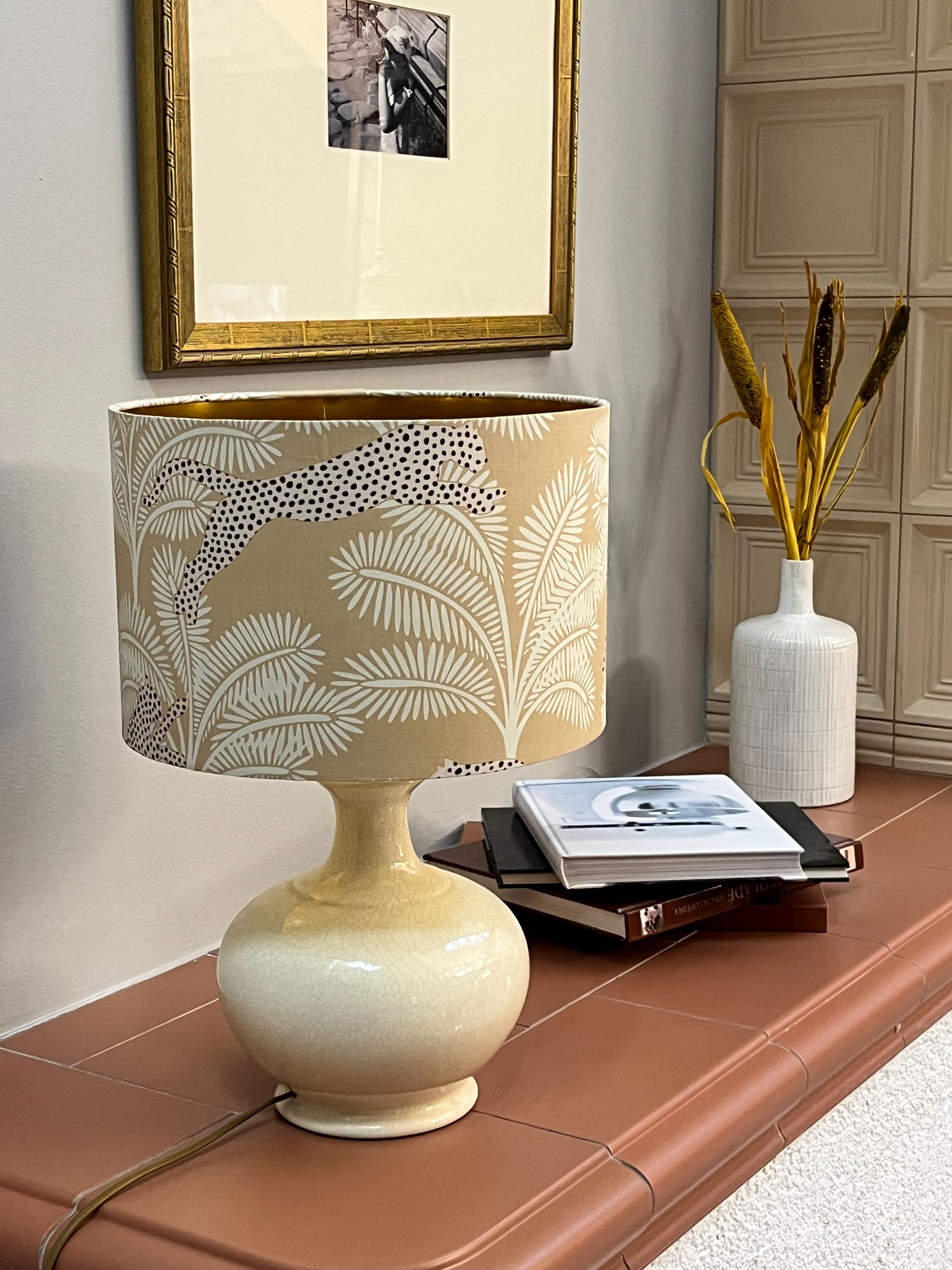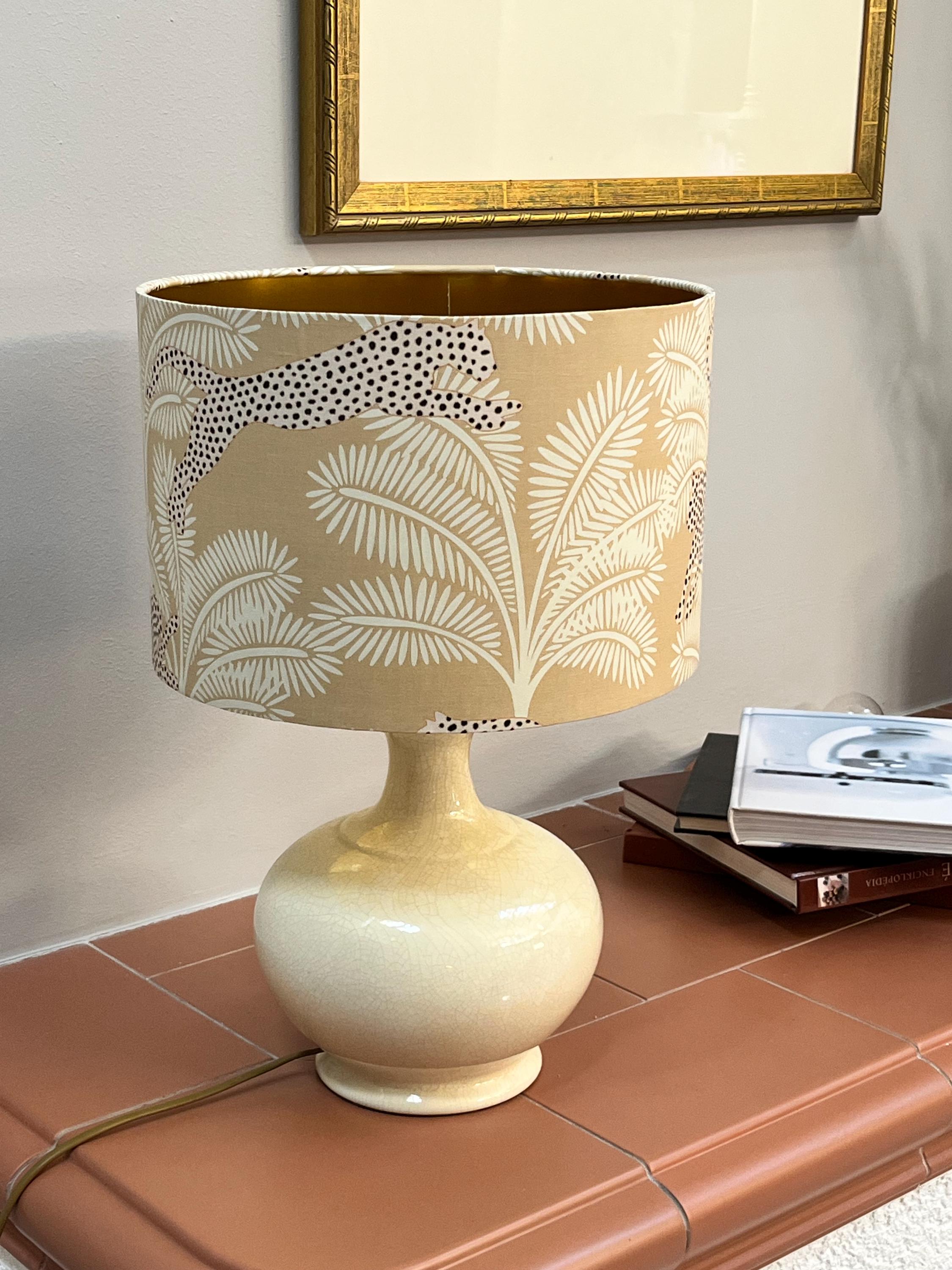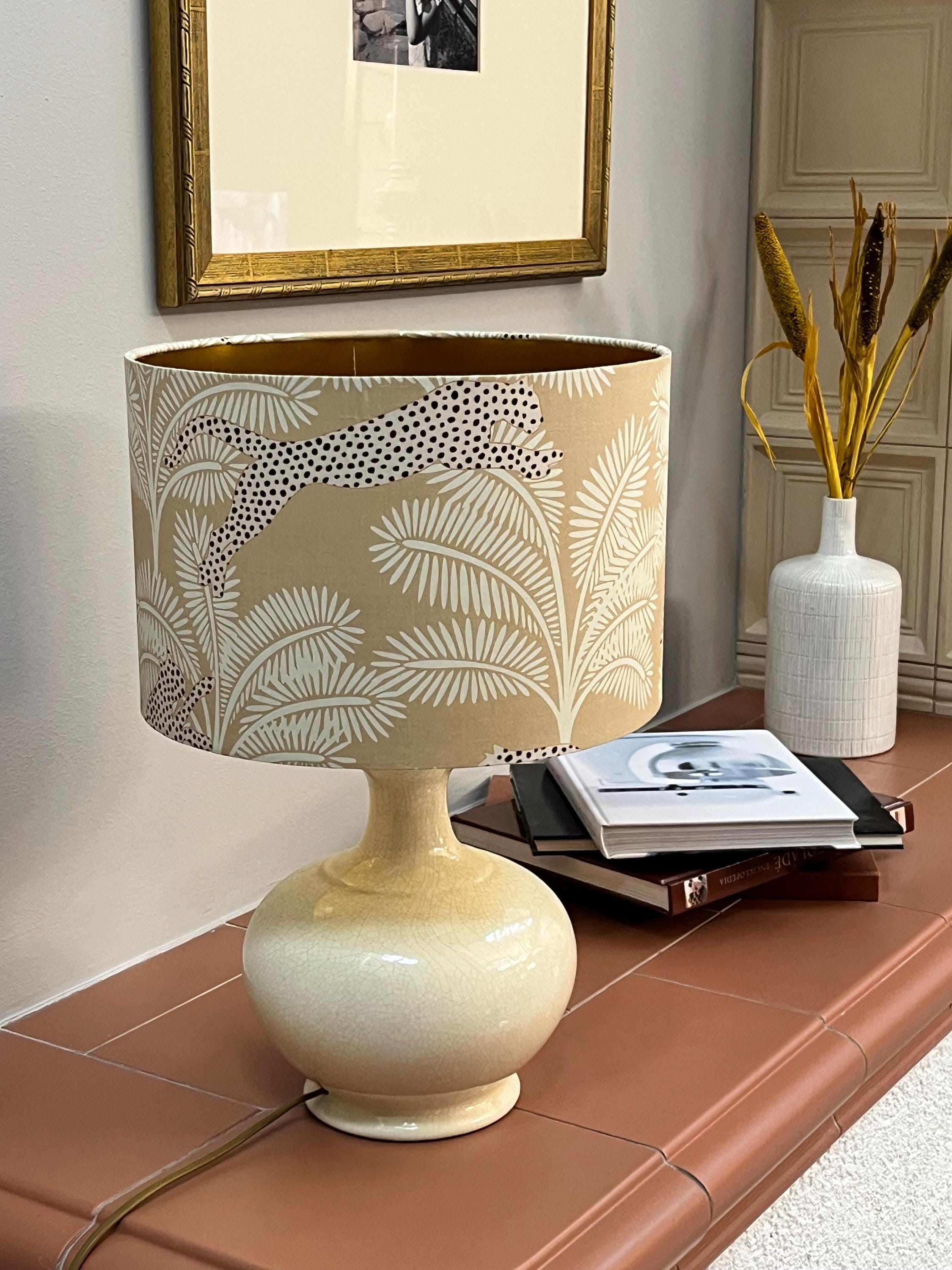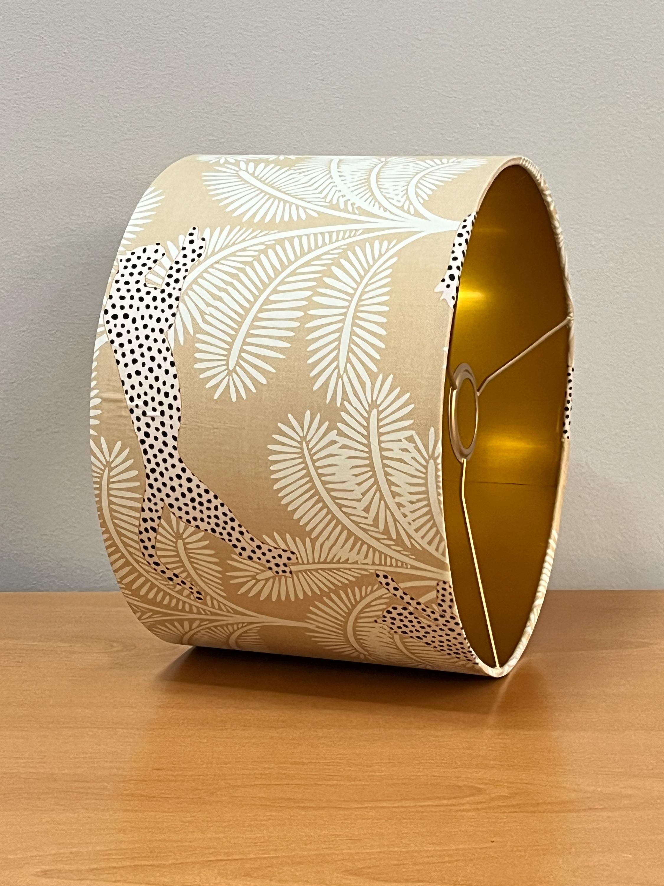 Illuminate your space with our stunning gold-colored lampshade! Adorned with exquisite beige palm trees and a striking panther design, this unique piece effortlessly blends elegance and style. Perfect for adding a touch of exotic flair to any room, this lampshade is ideal for your living room, bedroom, or office. Made with high-quality materials, it not only enhances your decor but also provides warm, inviting light. Upgrade your home decor with this eye-catching accent piece today!