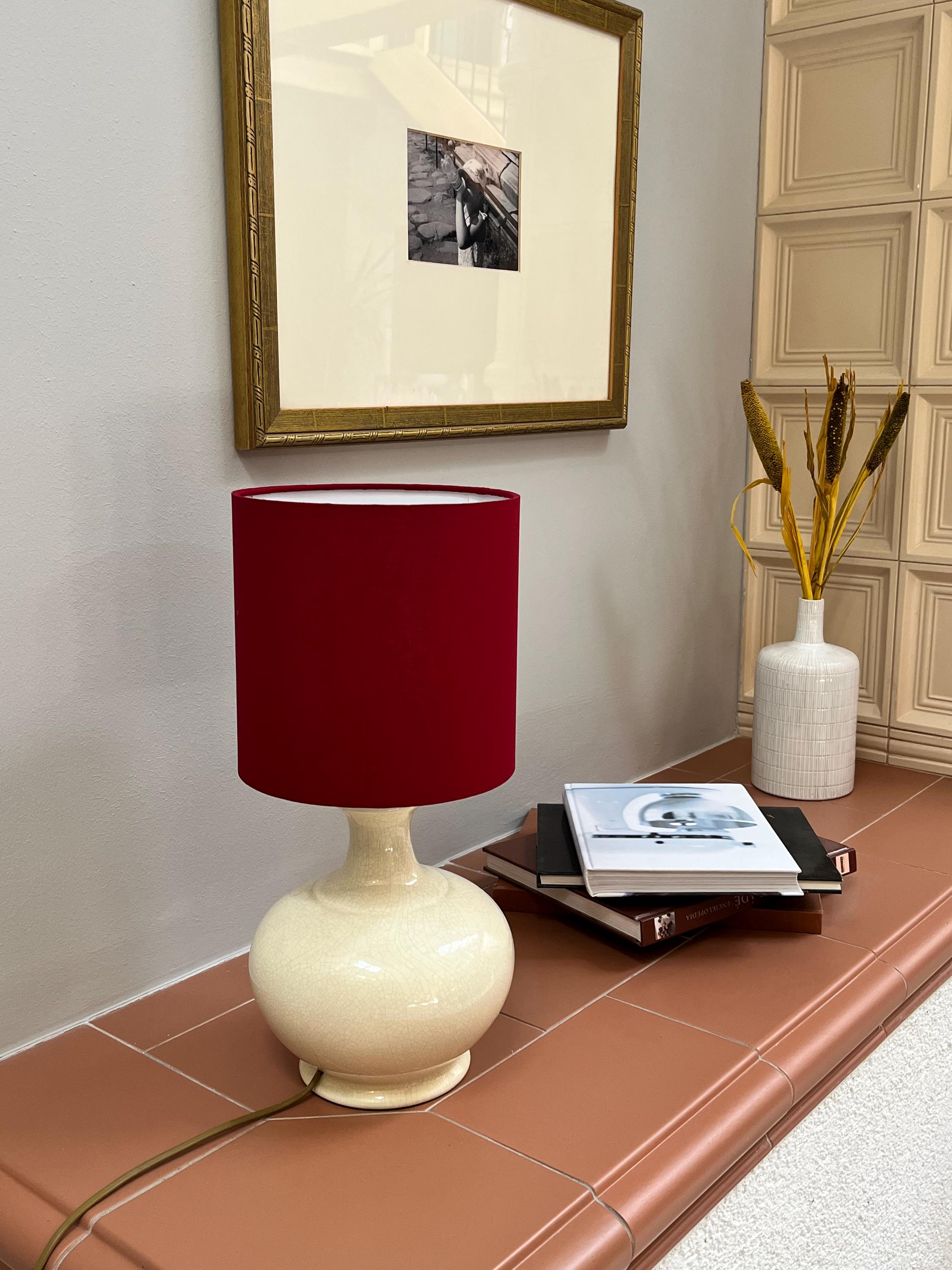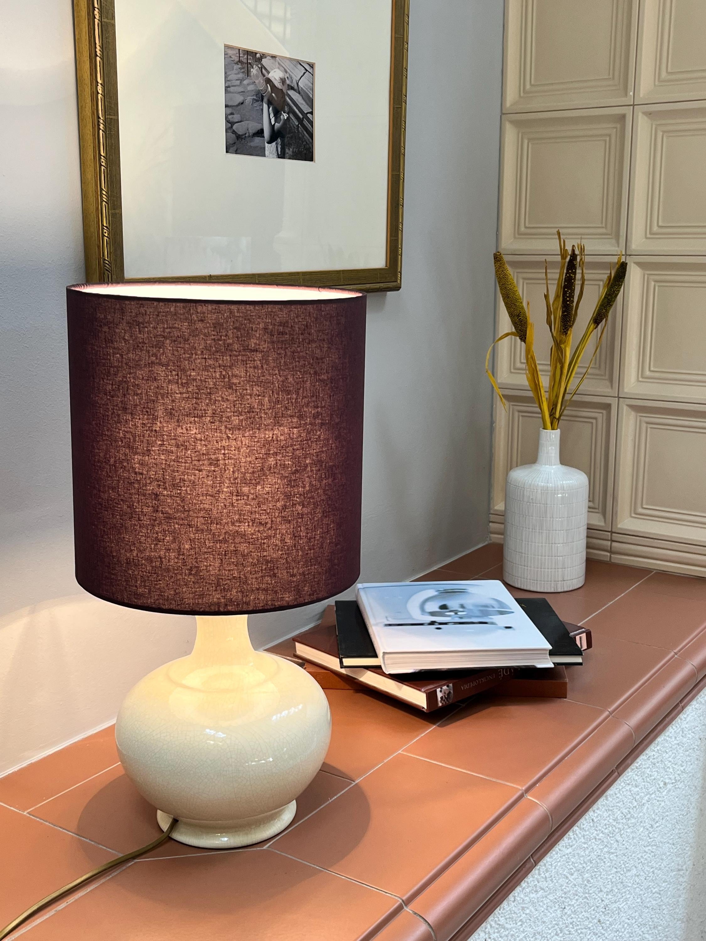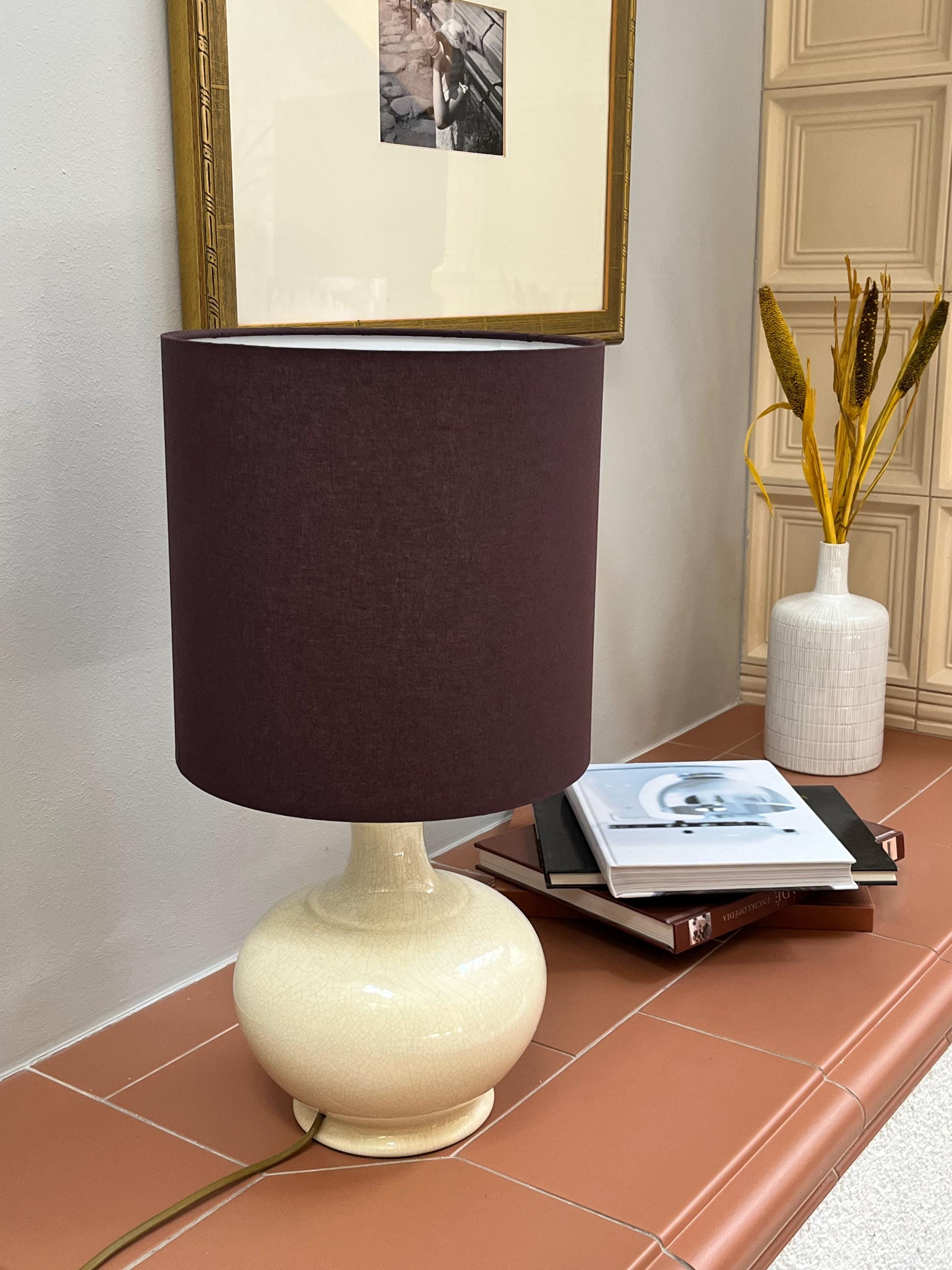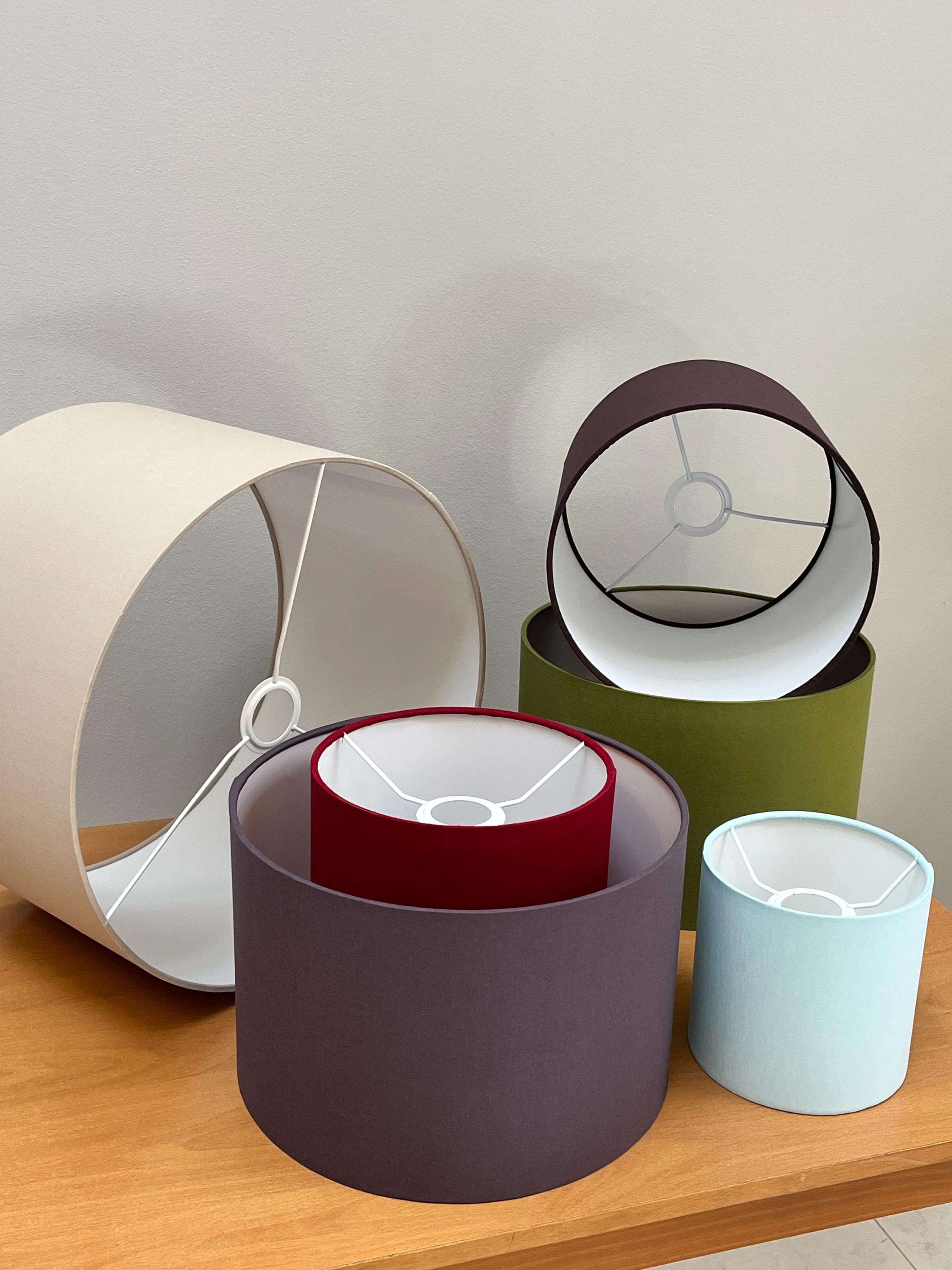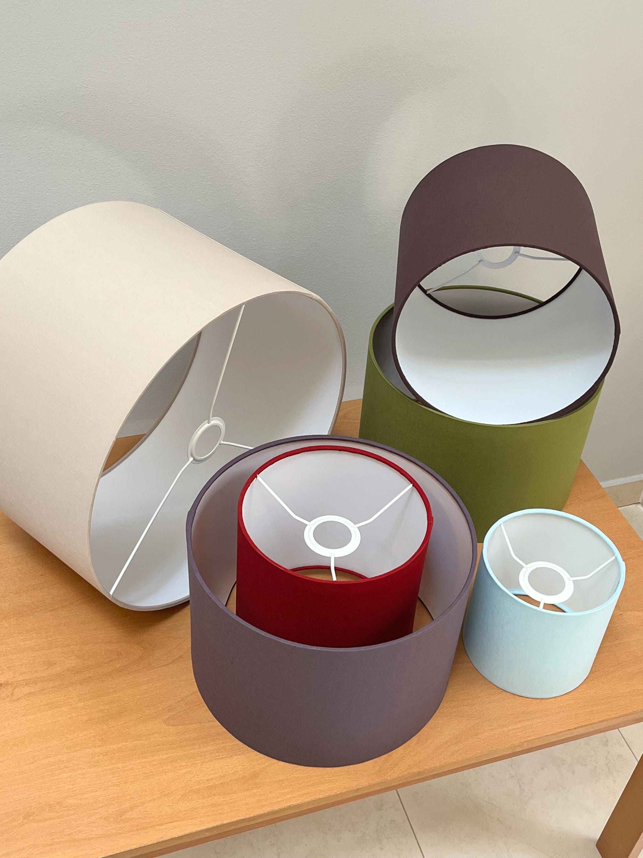 Unicolor handmade drum lampshades are available in many colors, from subdued beige and off-white to characteristic dark green, navy blue or burgundy. Light colors diffuse the light pleasantly, ideal for a living room, bedroom or reading corner, while darker shades provide a more cozy, intimate light, for example above a dining table or bedside lamp. This solid color lampshade is available in 70 colors.