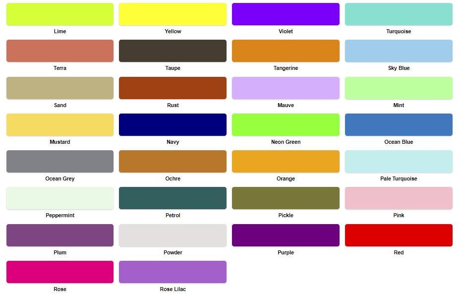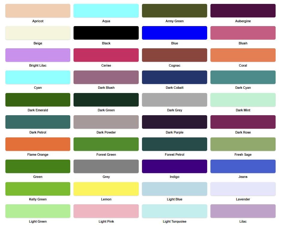 Apricot, aqua, army green, aubergine, beige, black, blue, blush, bright lilac, cerise, cognac, coral, cyan, dark blush, dark cobalt, dark cyan, dark emerald, dark green, dark reay, dark mint, dark petrol, dark powder, dark purple, dark rose, flame orange, forest green, forest petrol, fresh sage, green, grey, indigo, jeans, kelly green, lemon, light blue, lavender, light green, ligt turquoise, lilac, lime, yellow, violet, turquoise, terra, taupe, tangerine, sky blue, sand, rust, mauve, mint, mustard, navy, neon green, ocean blue, ocean grey, ochre, orange, pale turquoise, peppermint, petrol, pickle, pink, plum, powder, purple, red, rose, rose lilac