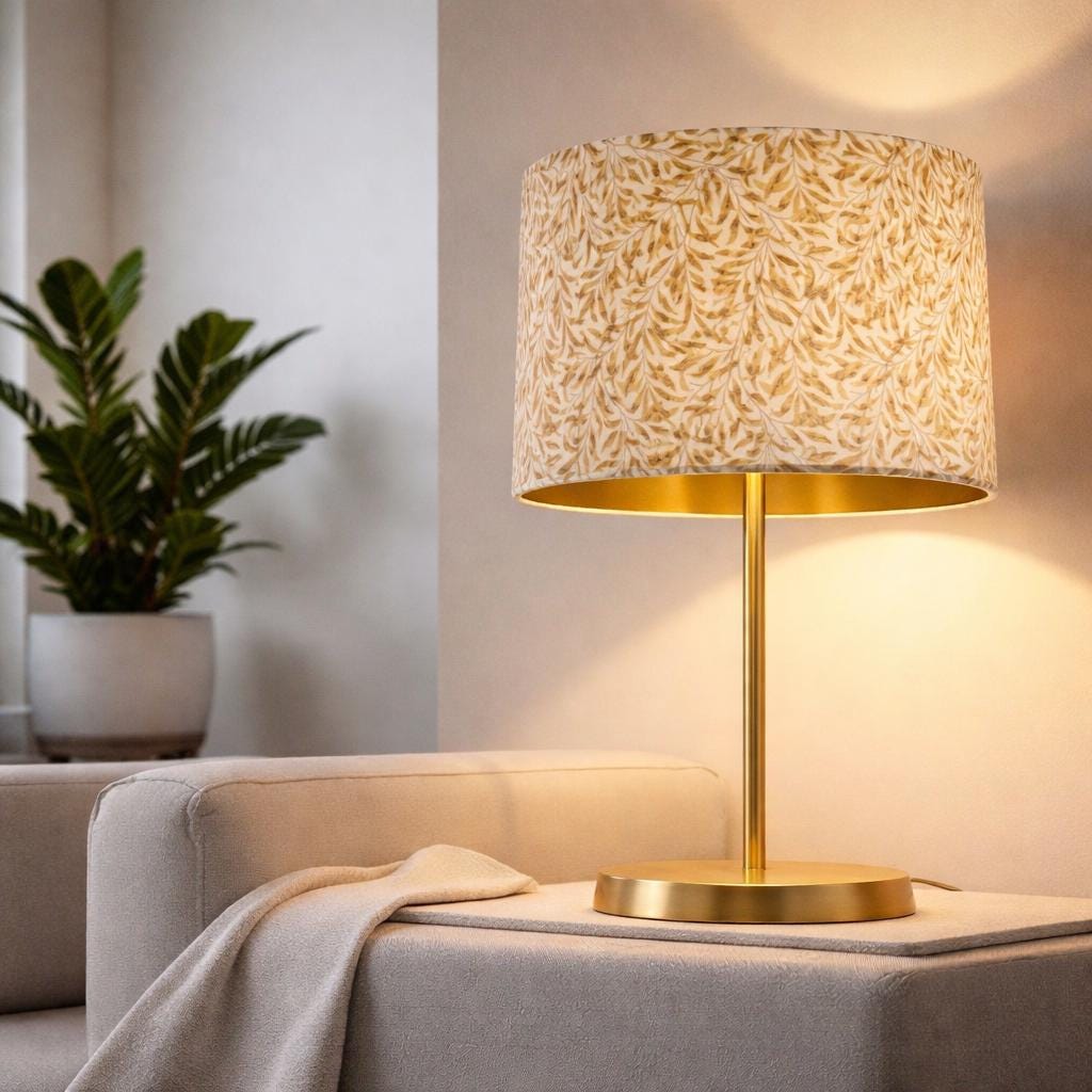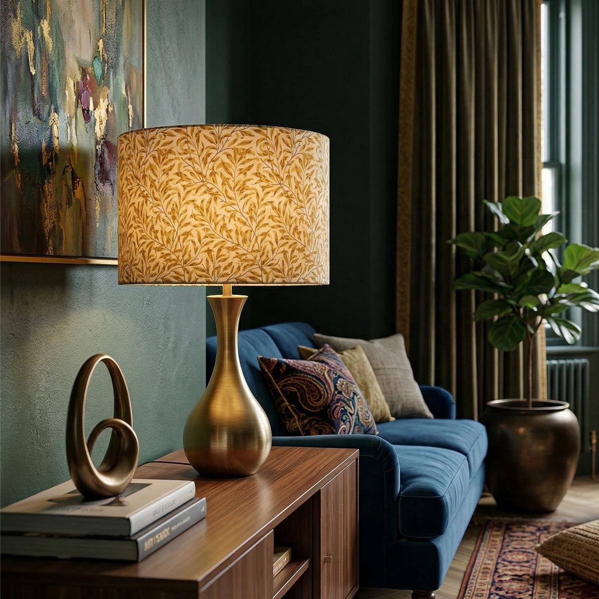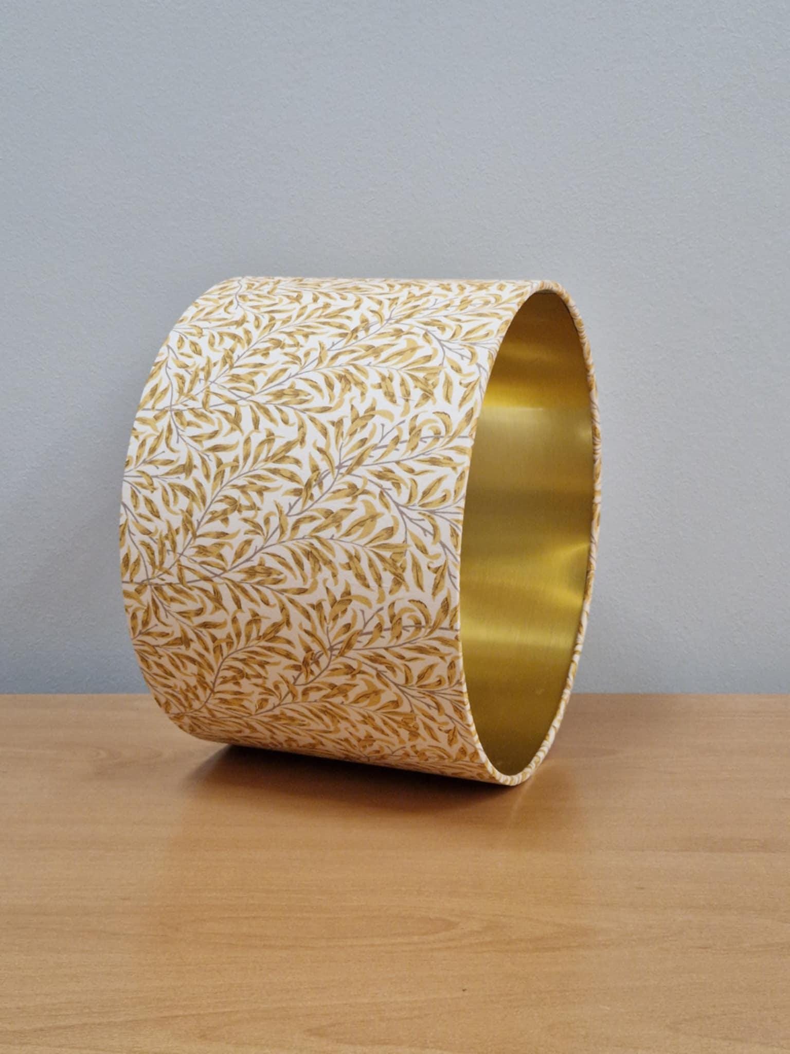 Light up your space with this stunning William Morris Willow Bough pattern lampshade. Featuring a vibrant yellow exterior, it brings a fresh and cheerful ambiance to any room. The contrasting gold interior enhances light reflection, creating a warm glow when illuminated. This lampshade is perfect for adding a touch of classic elegance to your decor. Ideal for living rooms, bedrooms, or offices. Illuminate your space with this beautiful blend of art and functionality!