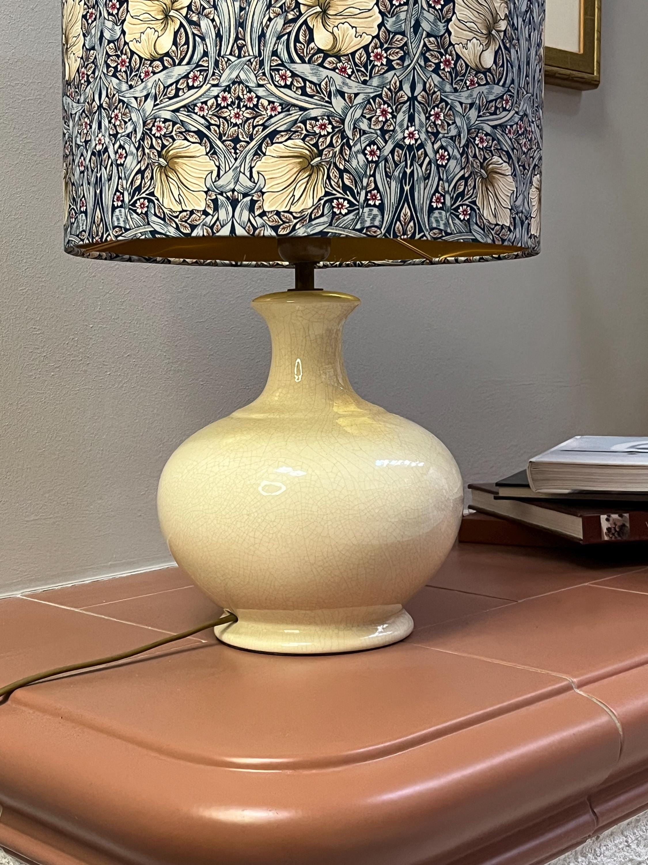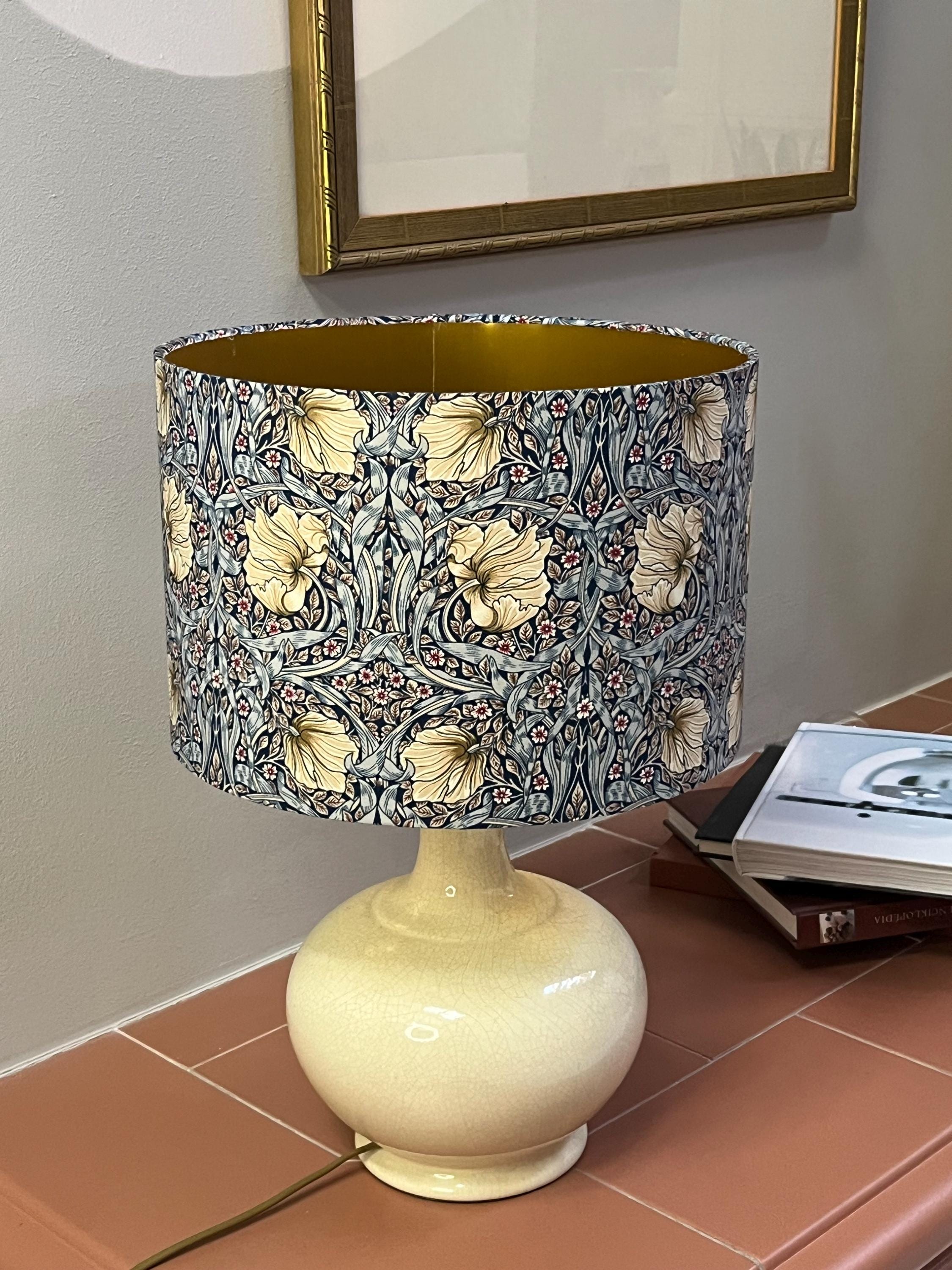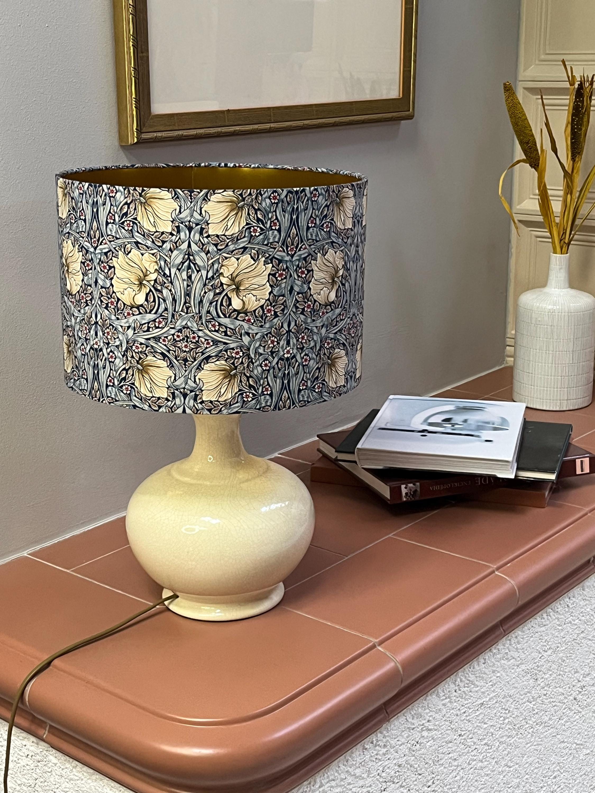 Add a touch of elegant charm to your space with this handmade lampshade inspired by the timeless William Morris style. Featuring a luxurious Pimpernel blue pattern, this lampshade will enhance any room with its intricate design. Illuminate your home in style with this unique piece!