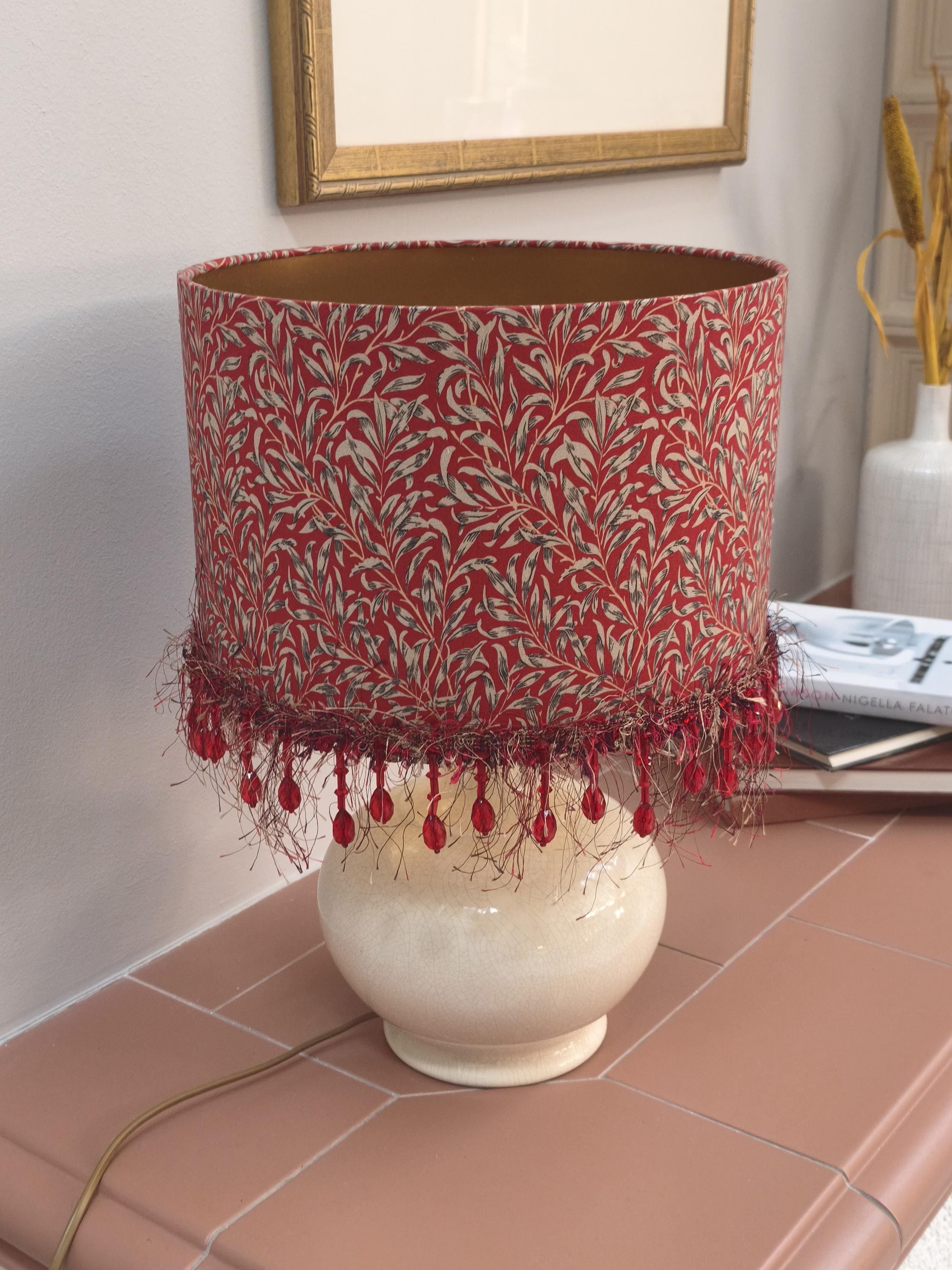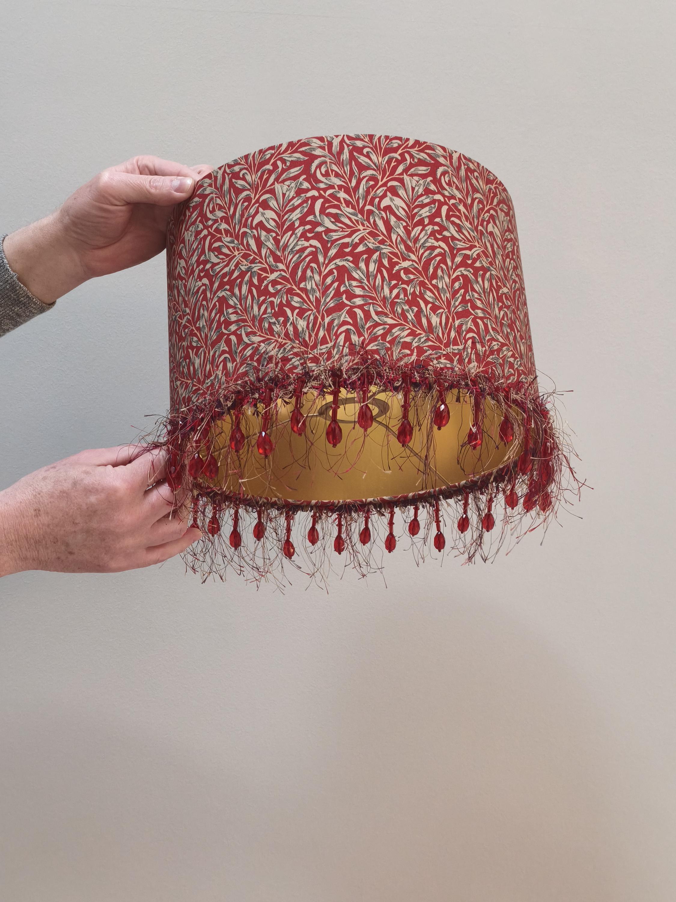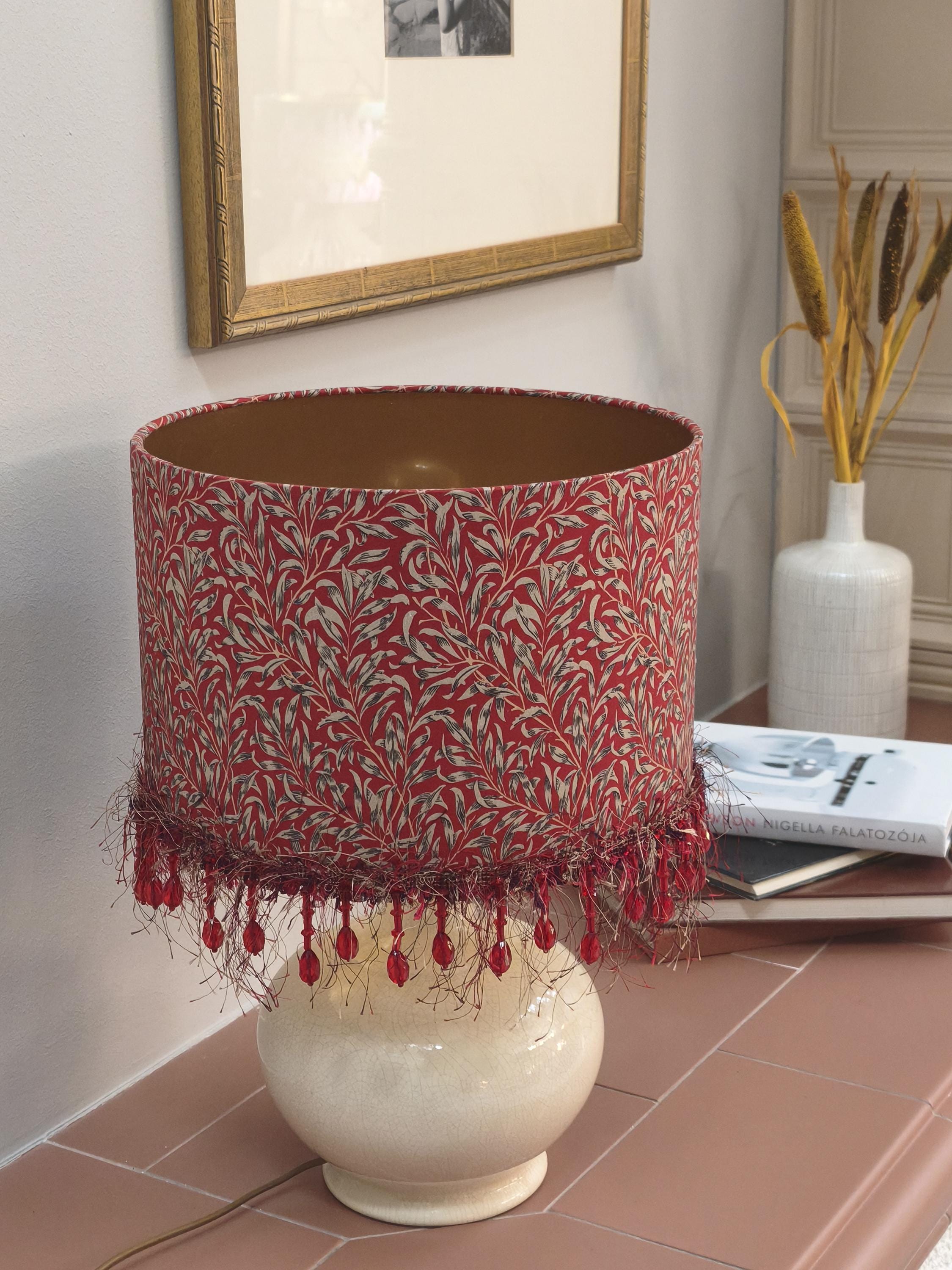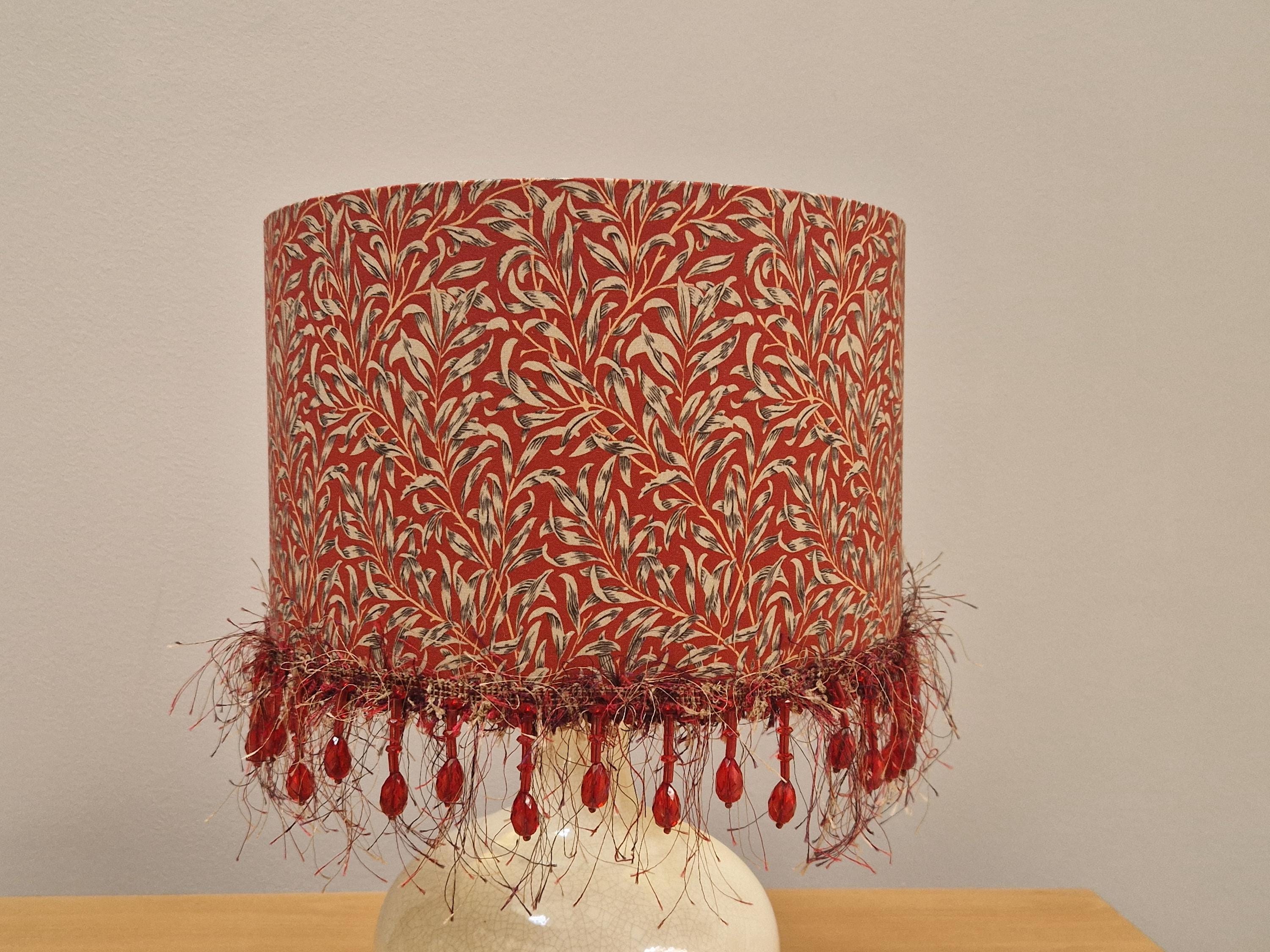 Illuminate your space with our stunning Red William Morris Willow Bough pattern lampshade, beautifully adorned with a delicate red beads fringe. This handcrafted piece combines timeless elegance with a vibrant pop of color, perfect for adding a touch of artful flair to any room. Designed to complement various decor styles, it’s ideal for your living room, bedroom, or office. Transform your lighting with this exquisite lampshade that combines functionality and style seamlessly. Upgrade your home decor today!