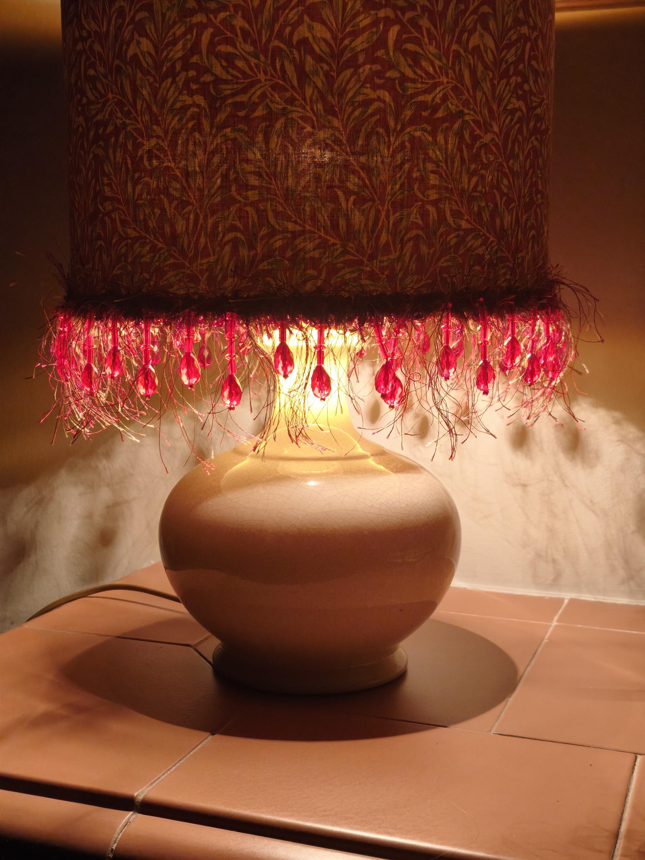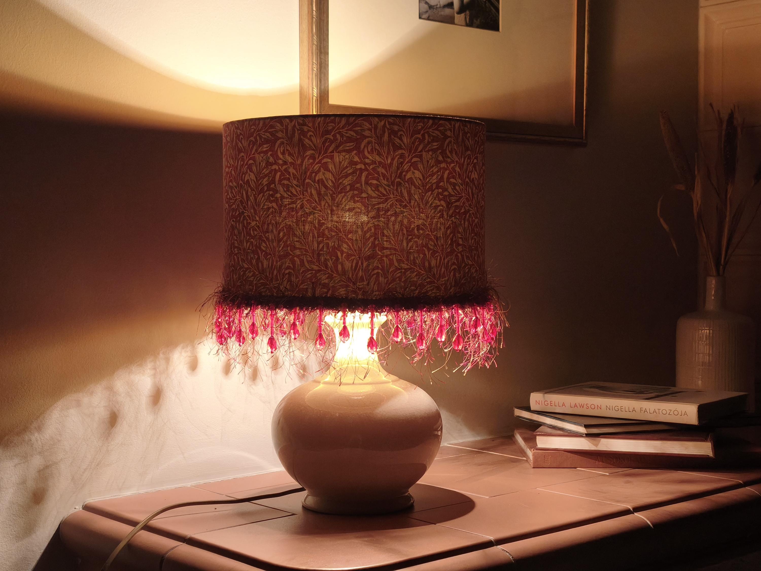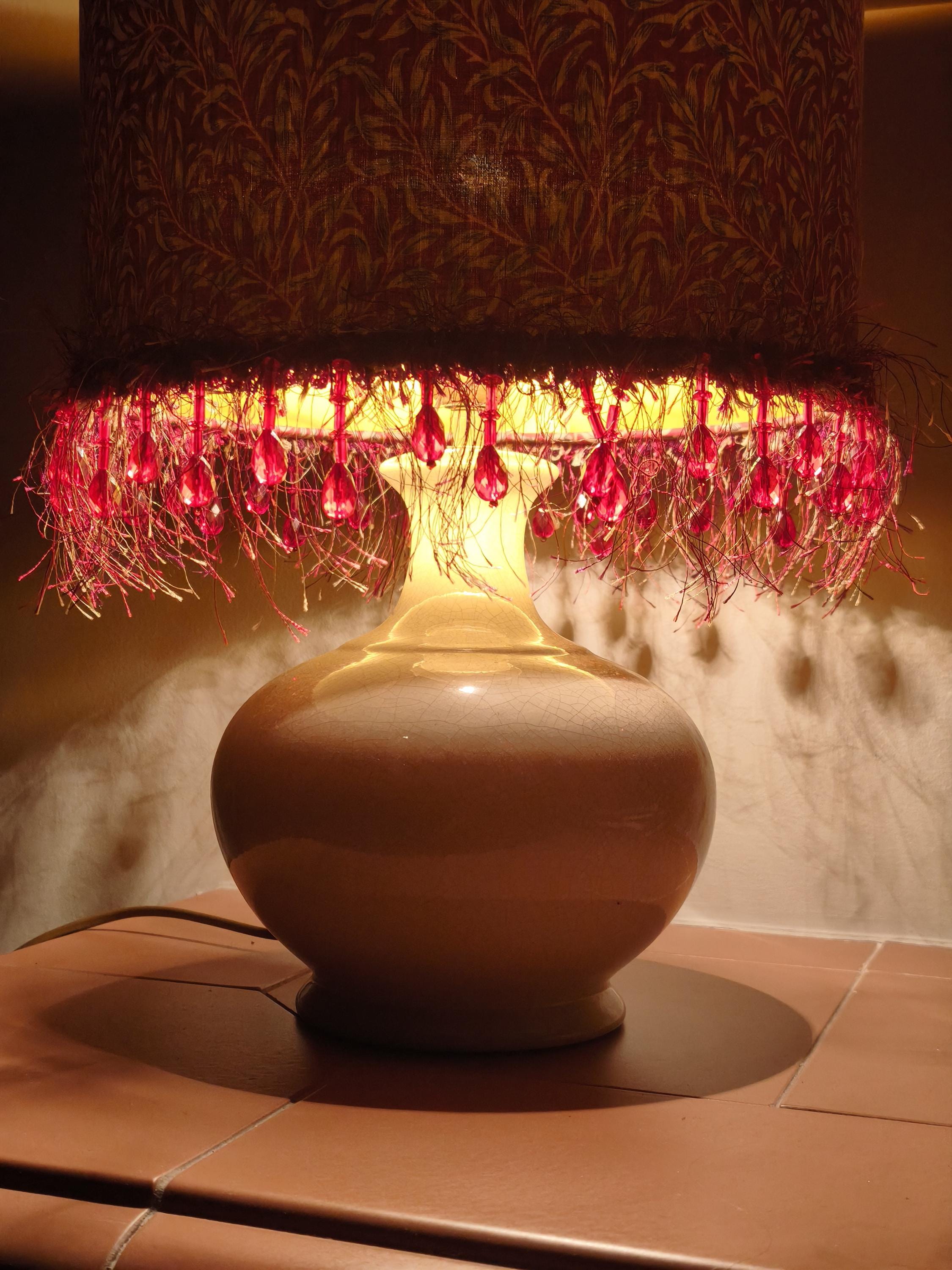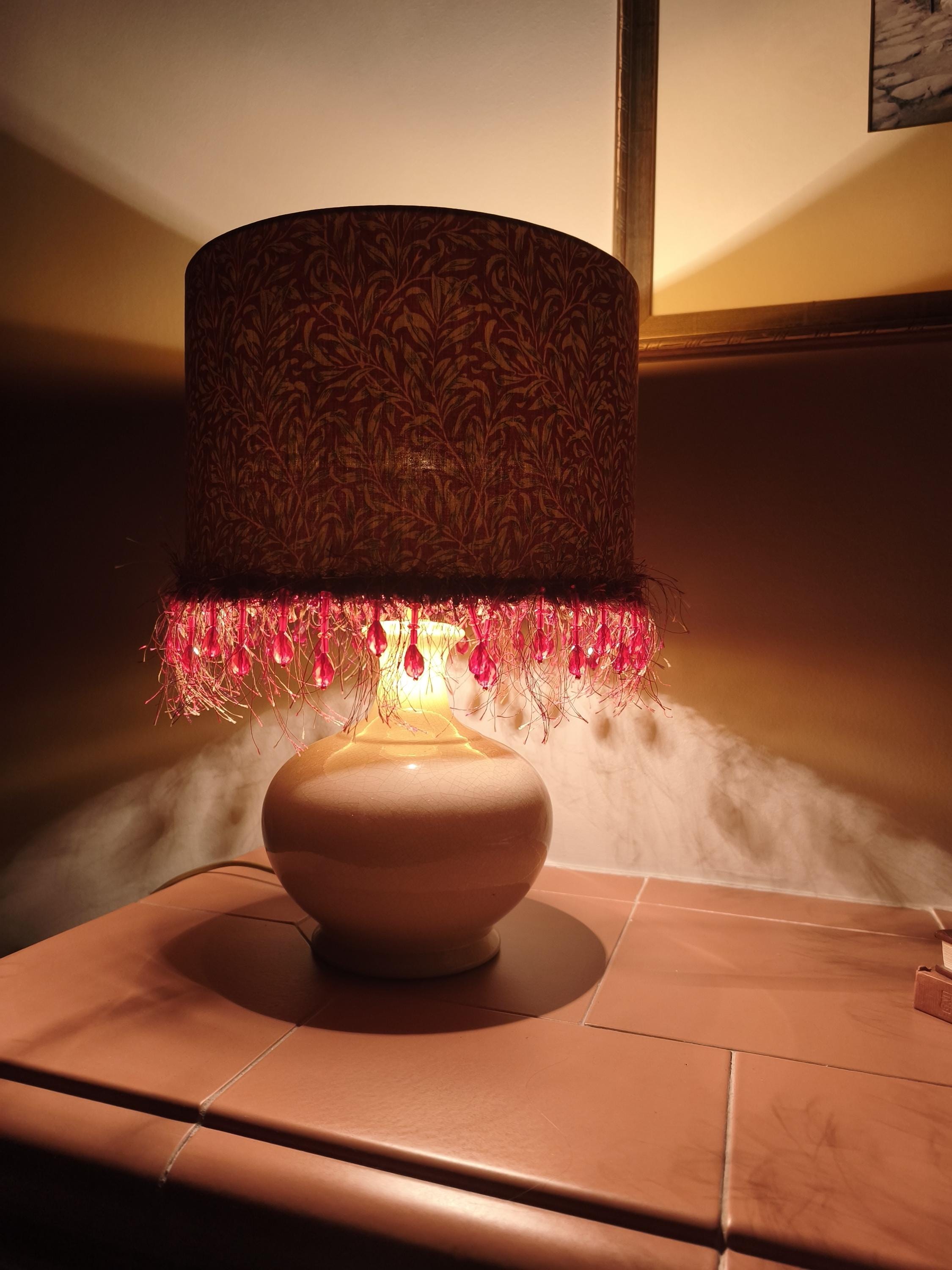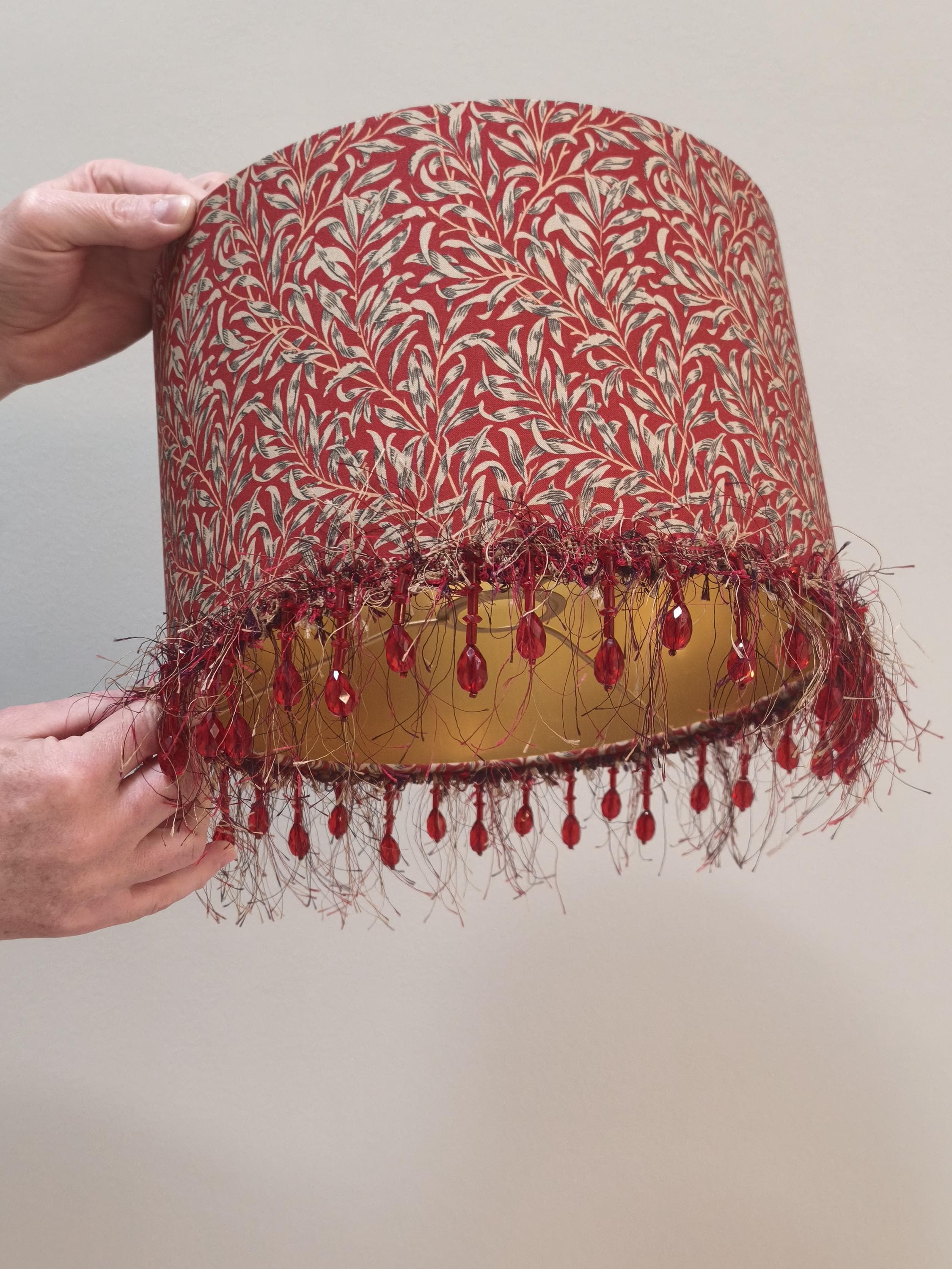 Illuminate your space with our stunning Red William Morris Willow Bough pattern lampshade, beautifully adorned with a delicate red beads fringe. This handcrafted piece combines timeless elegance with a vibrant pop of color, perfect for adding a touch of artful flair to any room. Designed to complement various decor styles, it’s ideal for your living room, bedroom, or office. Transform your lighting with this exquisite lampshade that combines functionality and style seamlessly. Upgrade your home decor today!