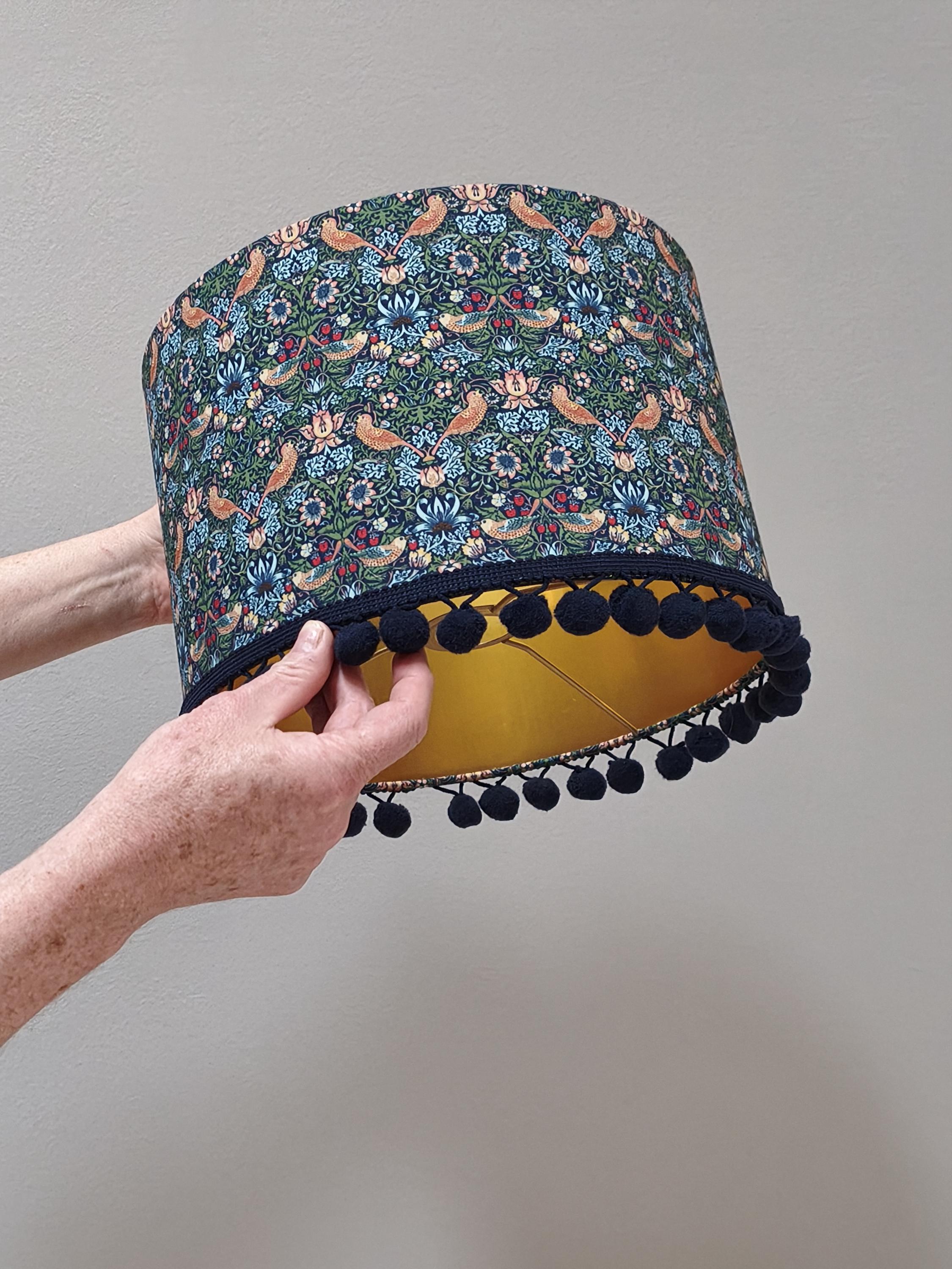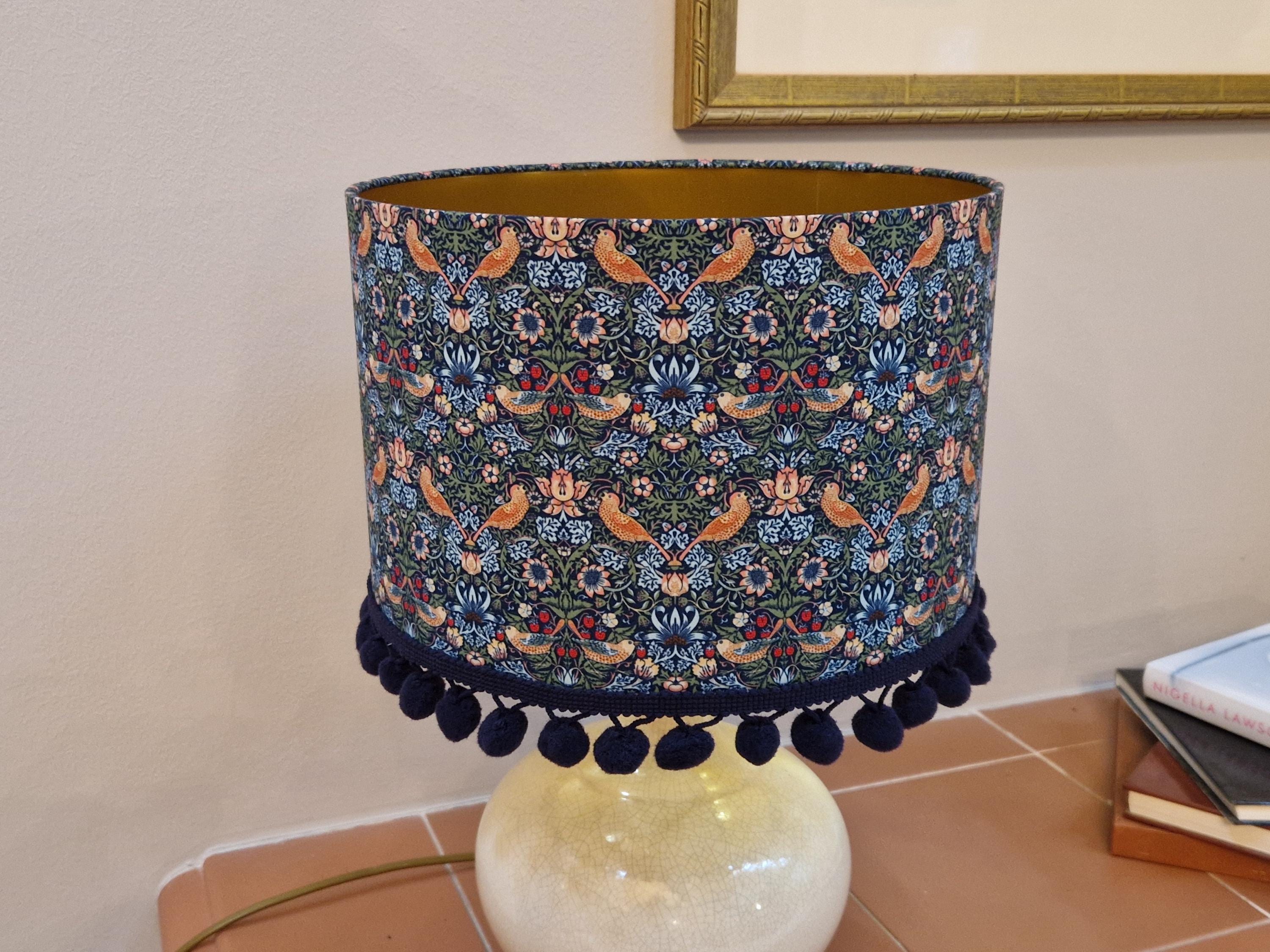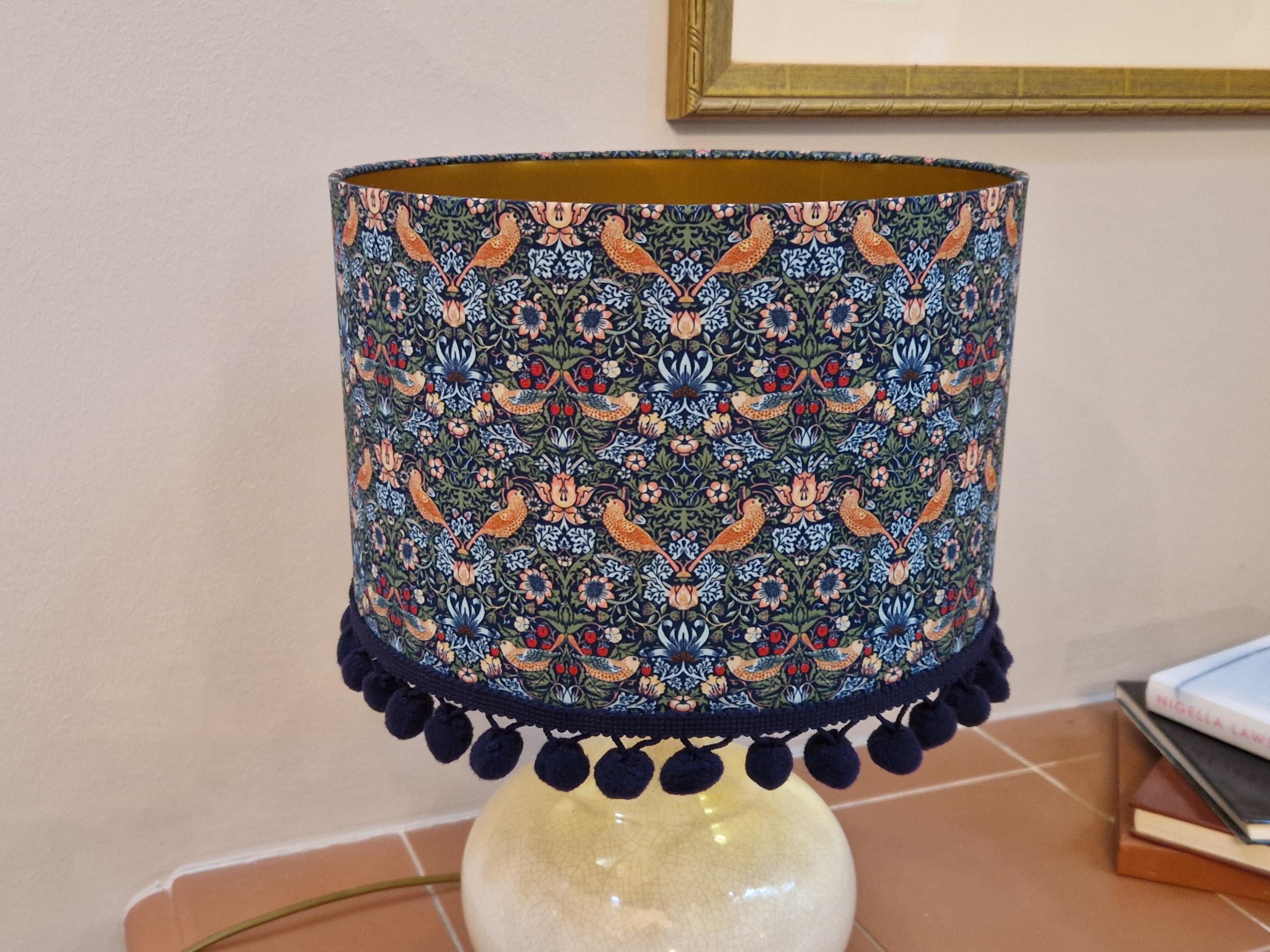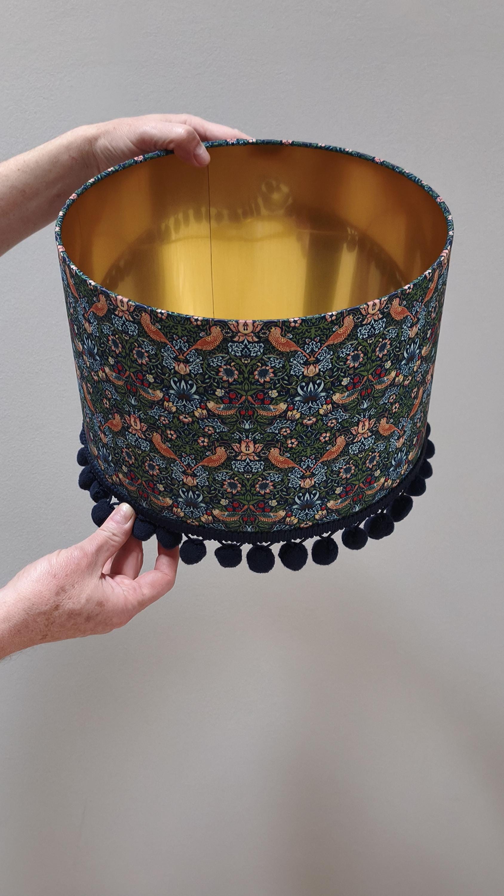 Elevate your space with our Handmade Gold Lined Lampshade featuring the iconic William Morris Strawberry Thief Design and pom-poms. This exquisite piece combines art and functionality, adding a touch of vintage elegance to any room. Crafted with care, the gold lining enhances the warm glow of your light, creating a cozy ambiance. Perfect for living rooms, bedrooms, or as a unique gift for design lovers. Illuminate your home with this stunning artisanal lampshade today!
