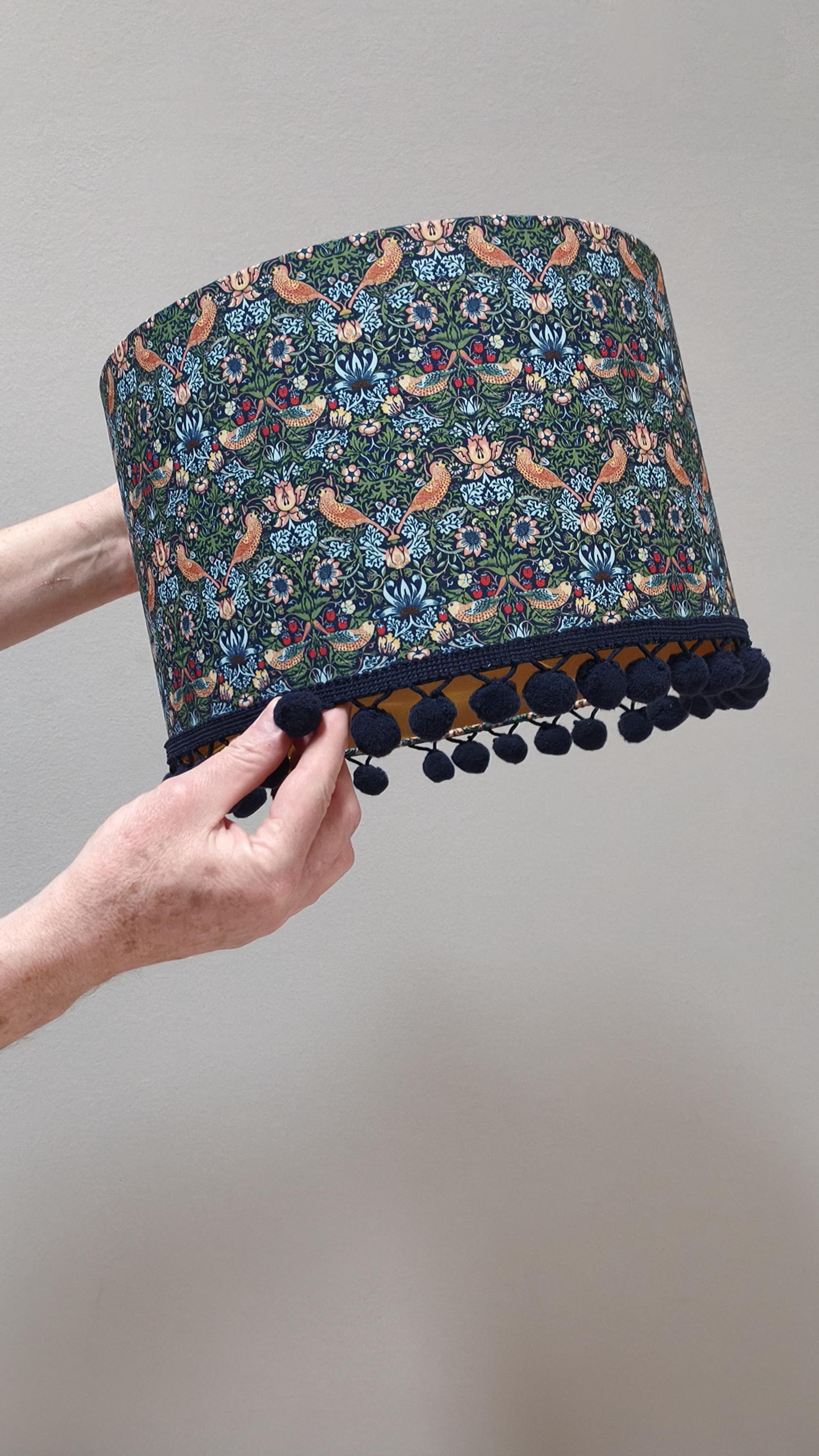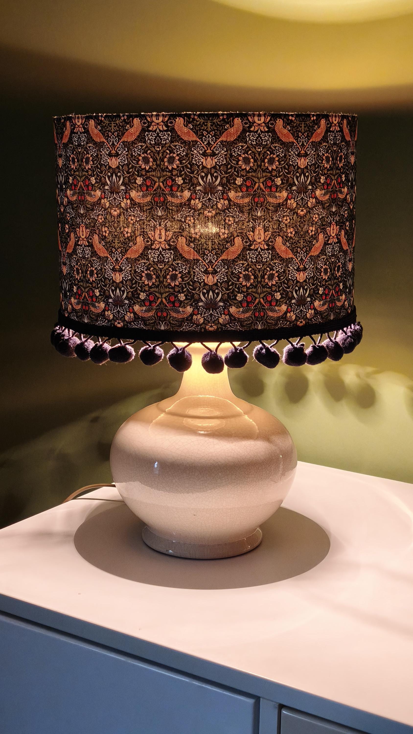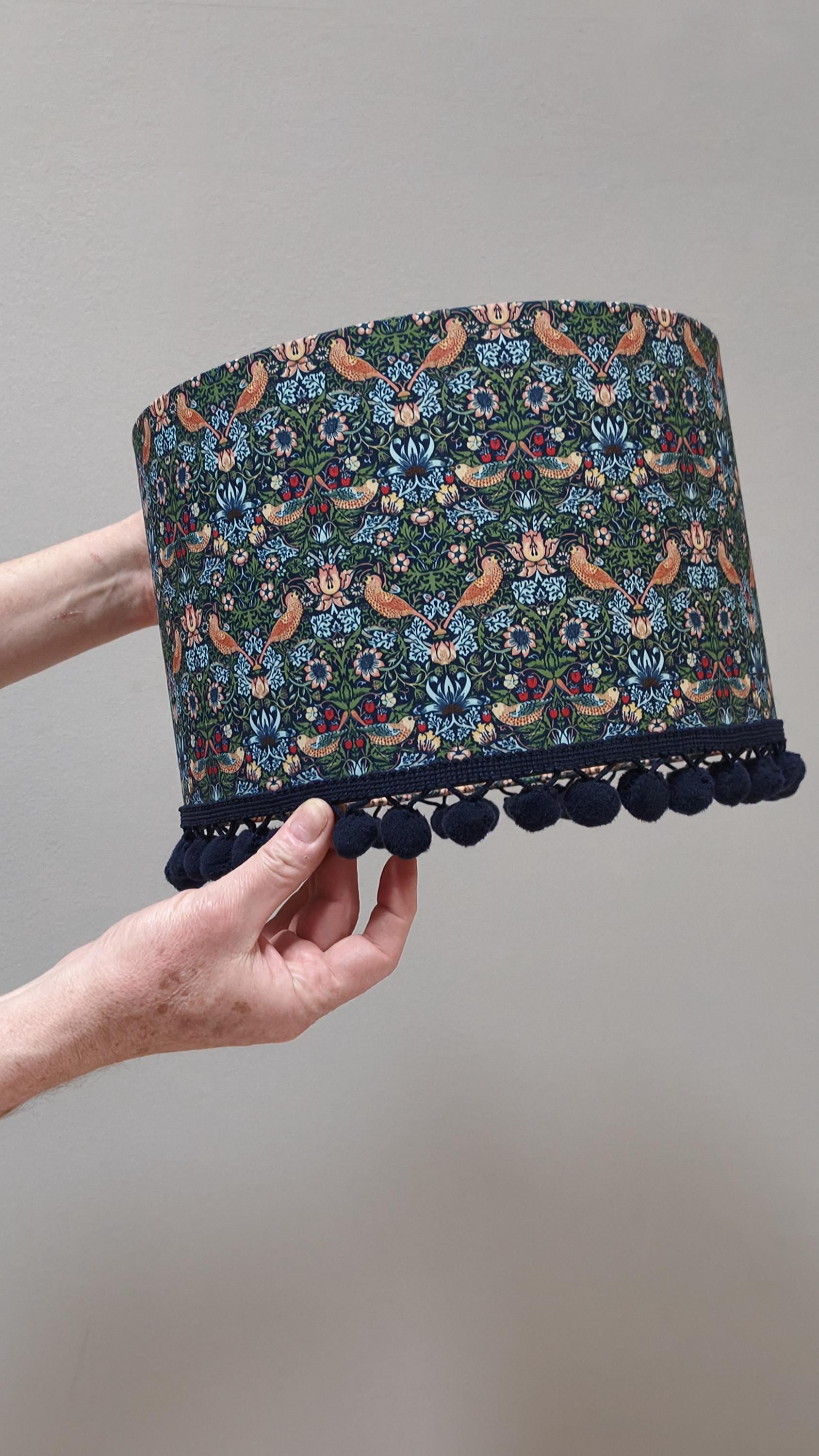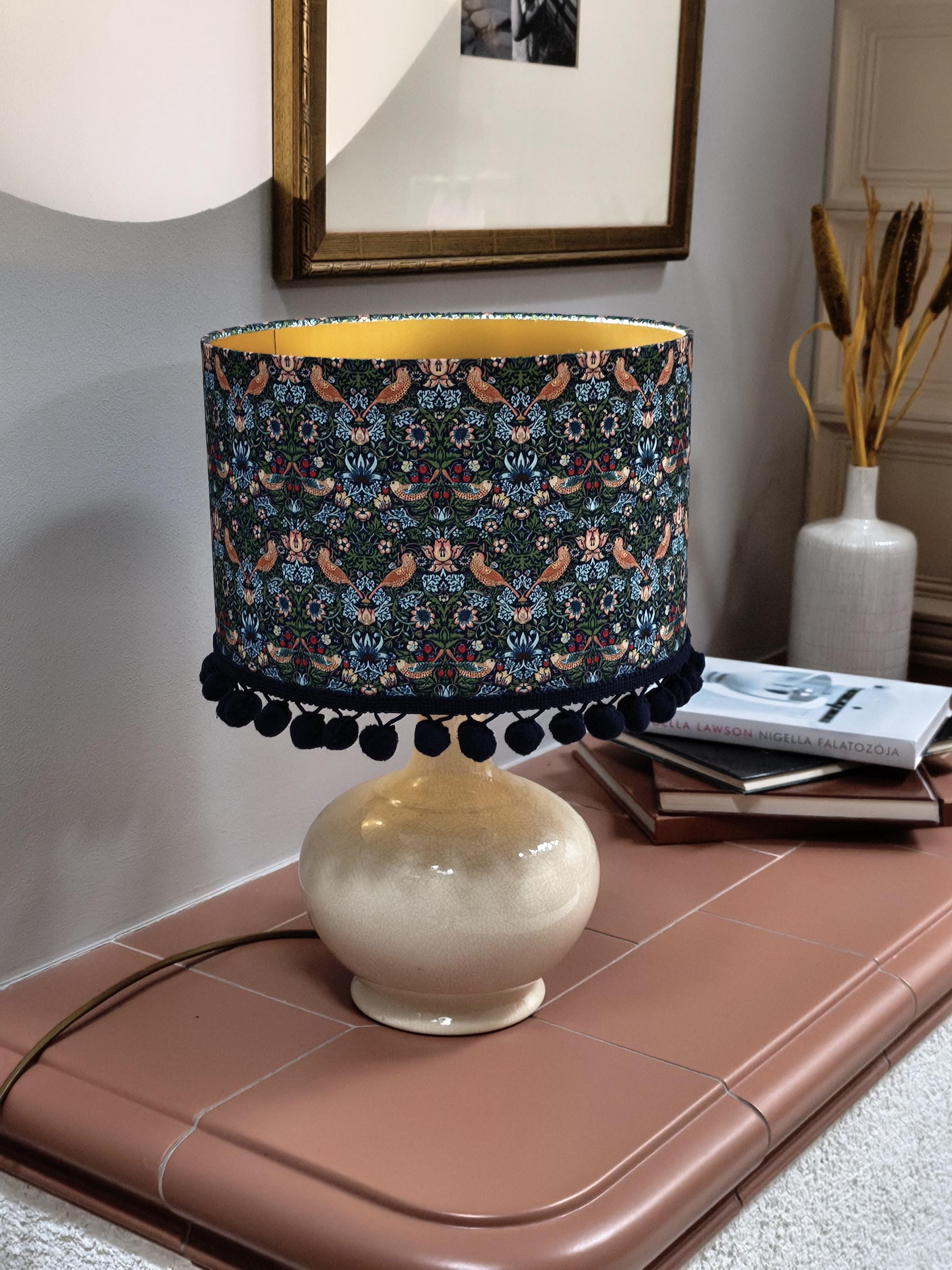 Elevate your space with our Handmade Gold Lined Lampshade featuring the iconic William Morris Strawberry Thief Design and pom-poms. This exquisite piece combines art and functionality, adding a touch of vintage elegance to any room. Crafted with care, the gold lining enhances the warm glow of your light, creating a cozy ambiance. Perfect for living rooms, bedrooms, or as a unique gift for design lovers. Illuminate your home with this stunning artisanal lampshade today!