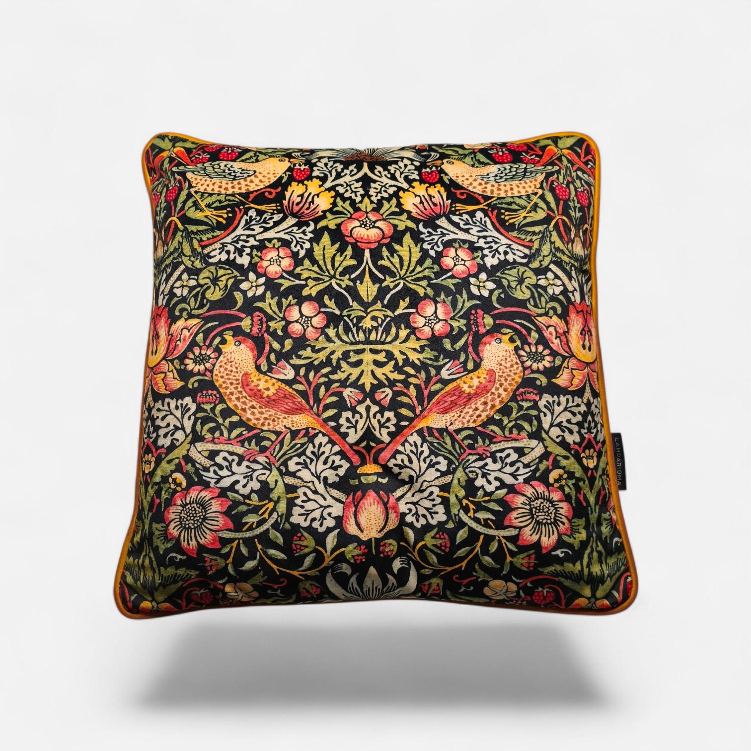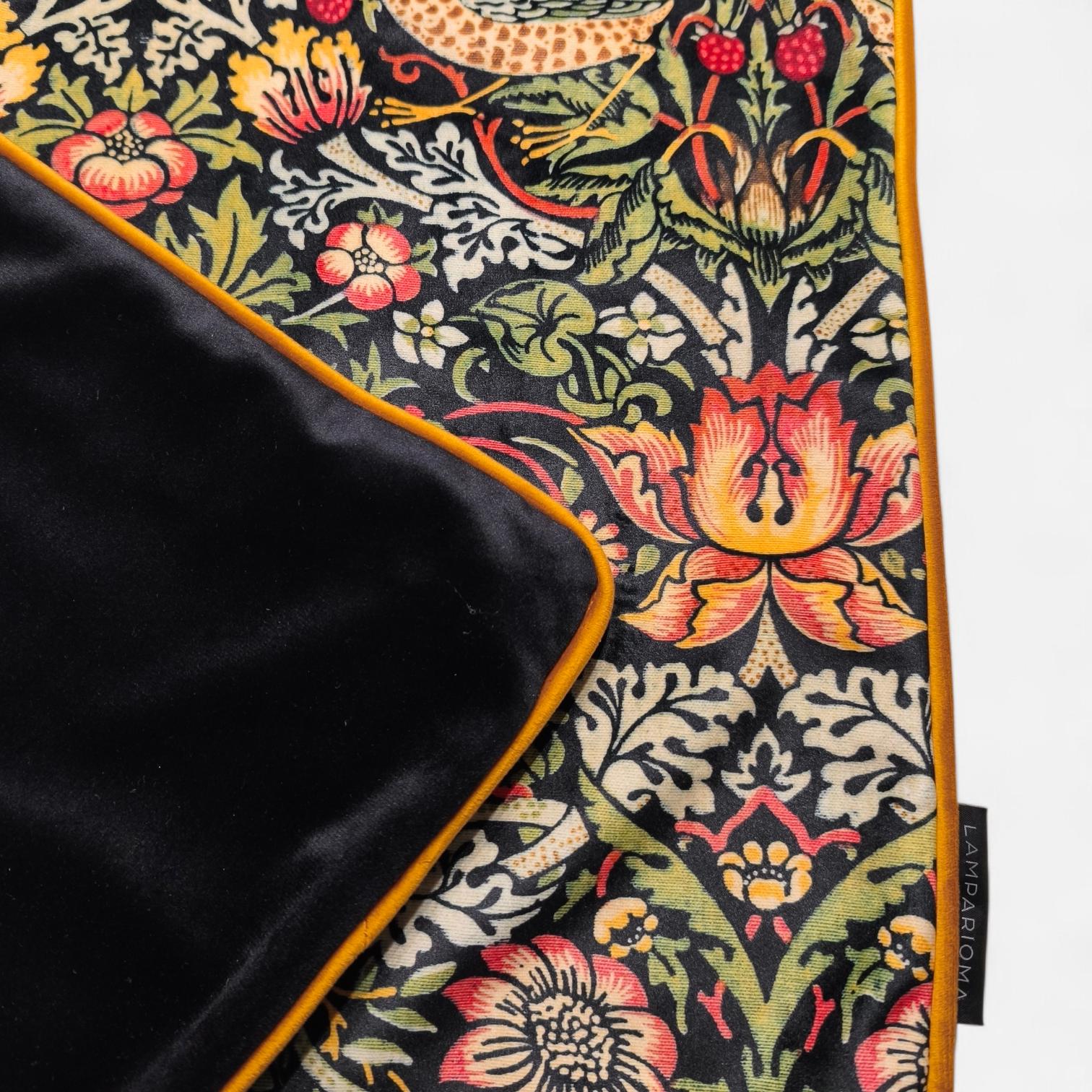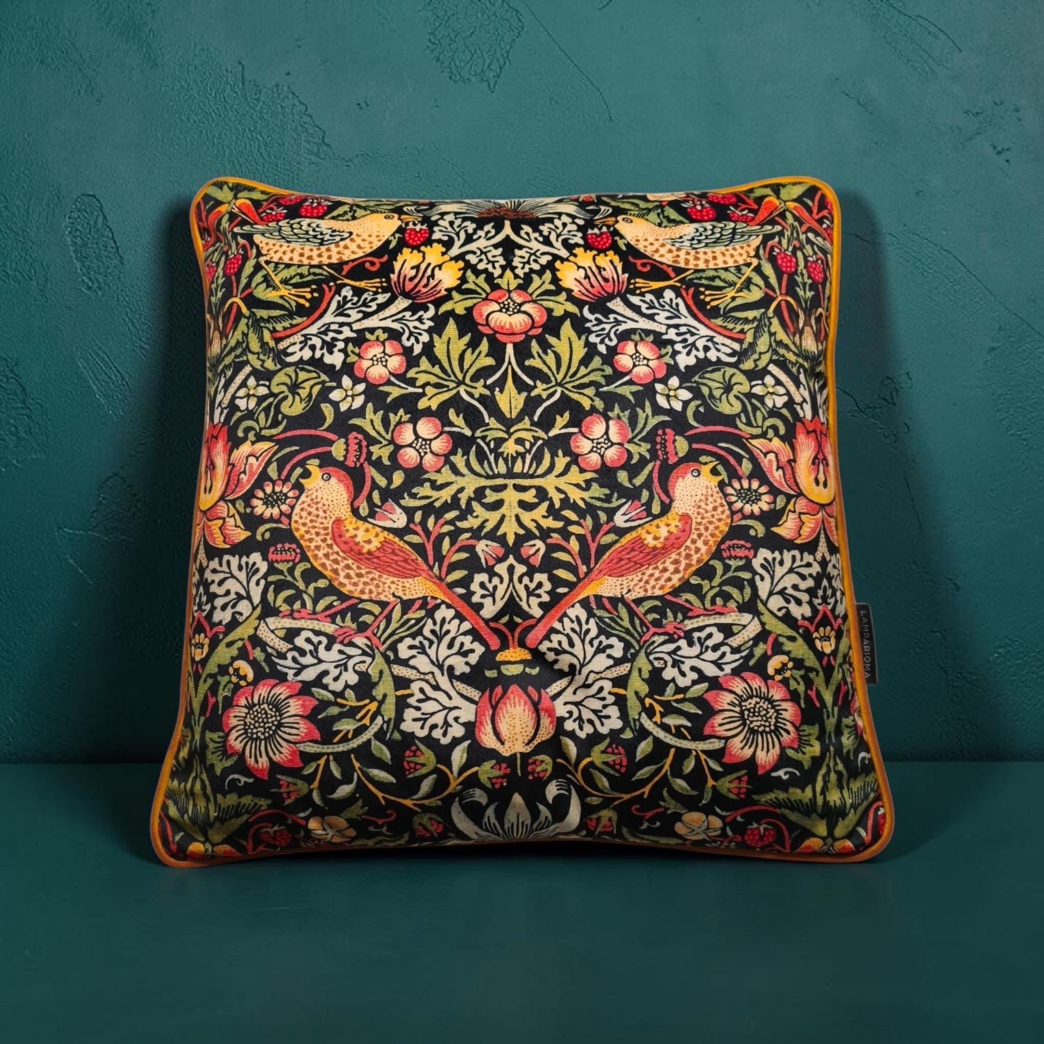 Elevate your home decor with this stunning William Morris Strawberry Thief pattern cushion cover. Featuring exquisite gold velvet piping for a touch of elegance and a luxurious black velvet backing, this cover beautifully combines classic artistry with modern sophistication. Perfect for sofas, beds, or accent chairs, it adds a stylish pop to any room. Made with quality fabrics, this unique piece is both durable and captivating. Transform your space today with this charming addition!