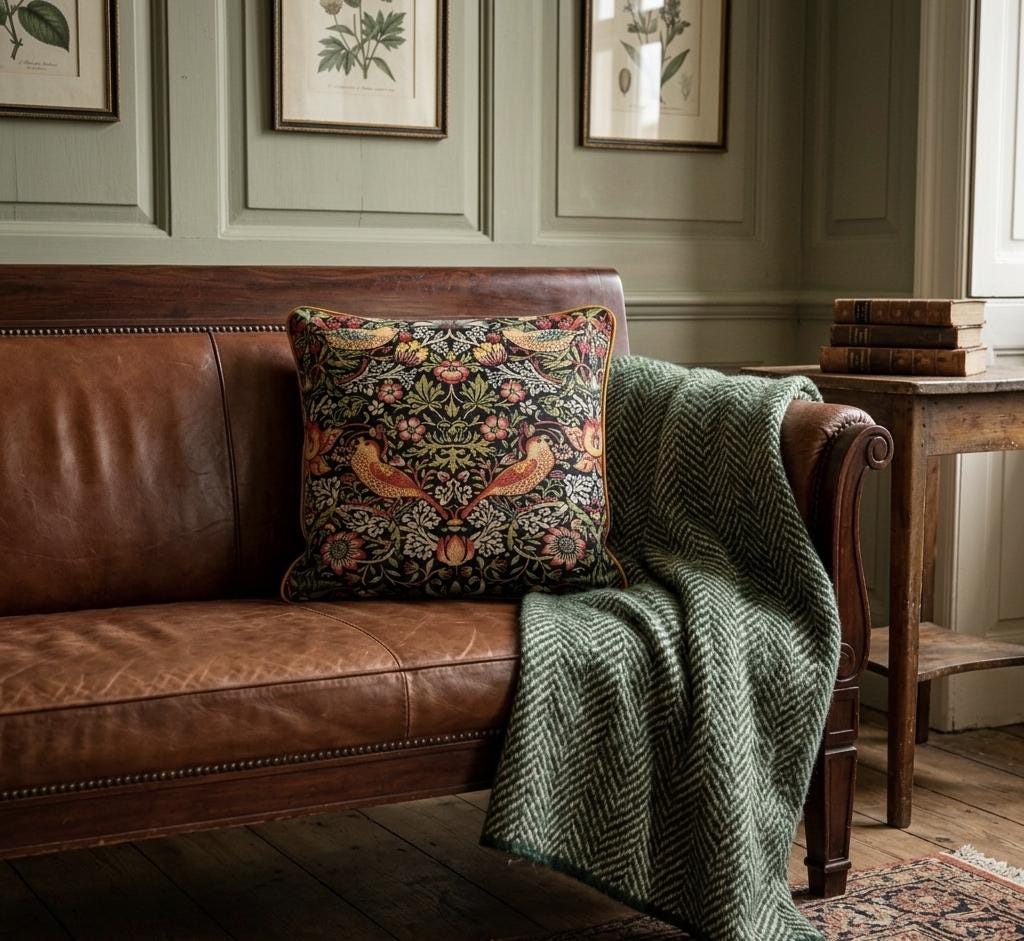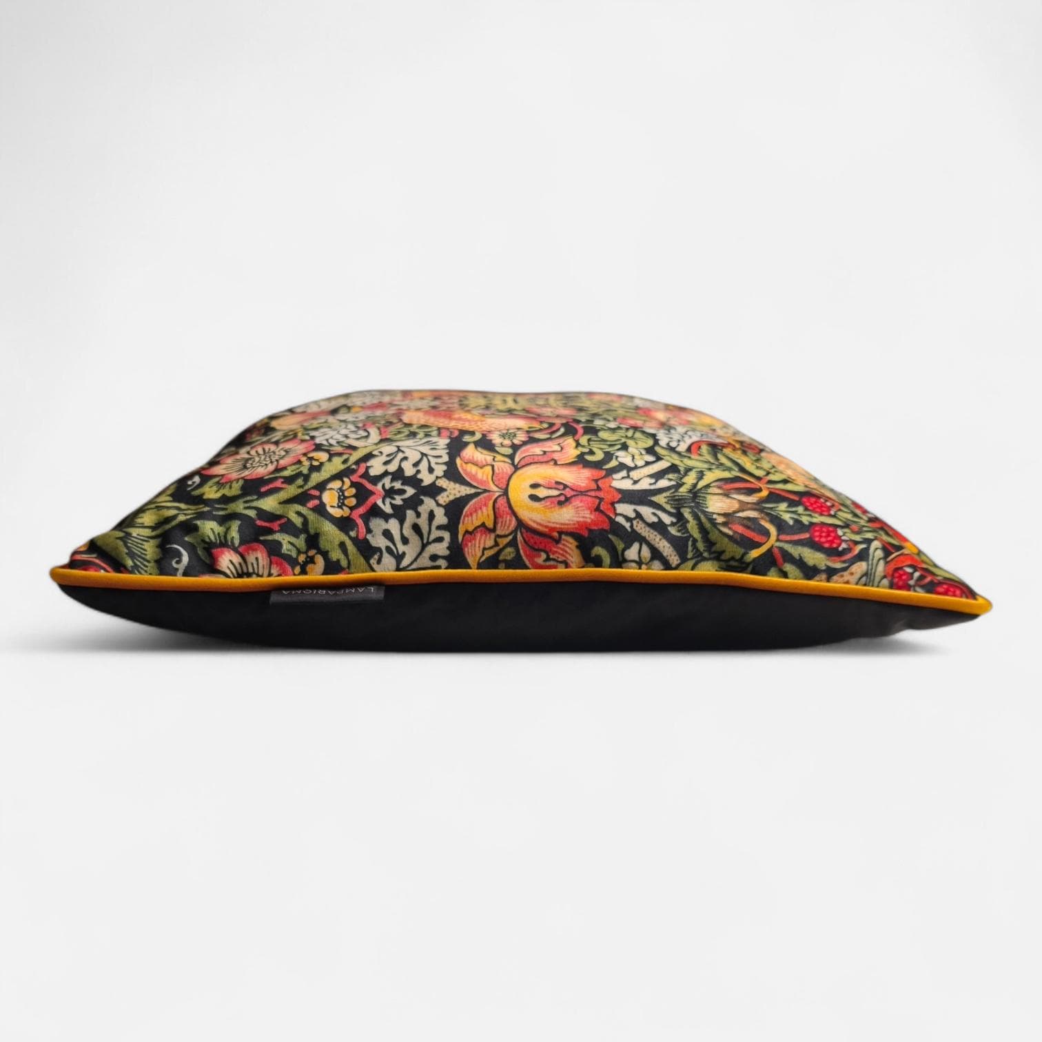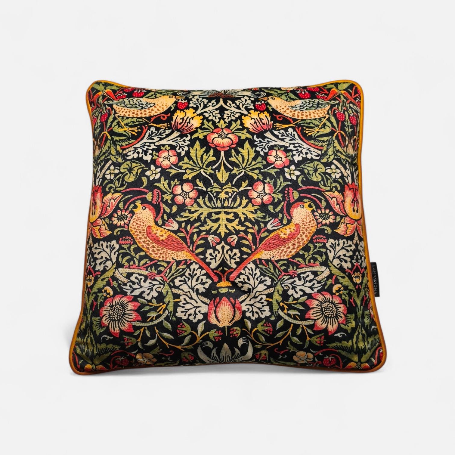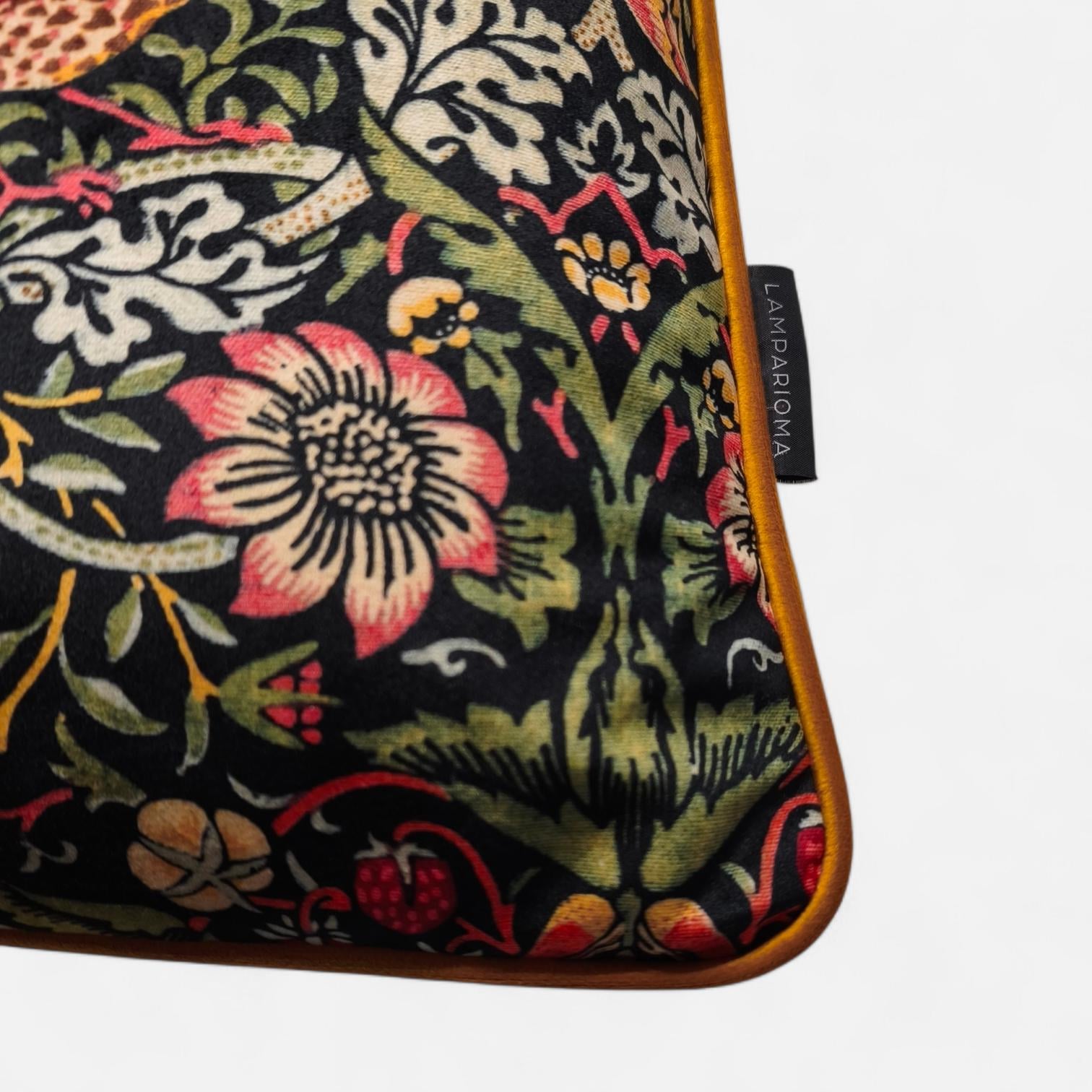 Elevate your home decor with this stunning William Morris Strawberry Thief pattern cushion cover. Featuring exquisite gold velvet piping for a touch of elegance and a luxurious black velvet backing, this cover beautifully combines classic artistry with modern sophistication. Perfect for sofas, beds, or accent chairs, it adds a stylish pop to any room. Made with quality fabrics, this unique piece is both durable and captivating. Transform your space today with this charming addition!